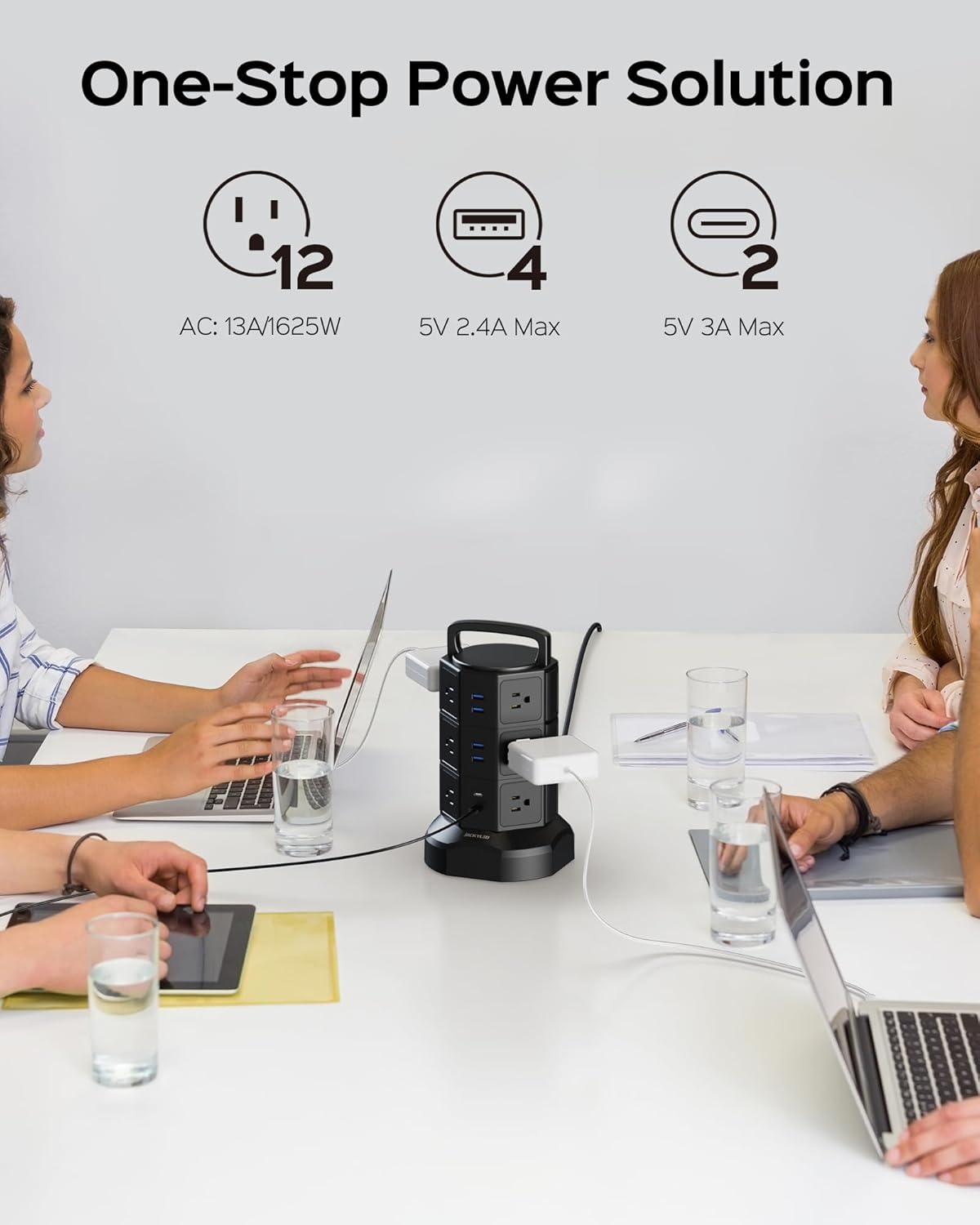 Power Strip Tower Surge Protector, JACKYLED 1625W 13A Outlet Surge Electric Tower, 12 Outlets 6 USB Ports Charging Station with 16AWG 6.5ft Heavy Duty Extension Cord for Home Office Dorm Black