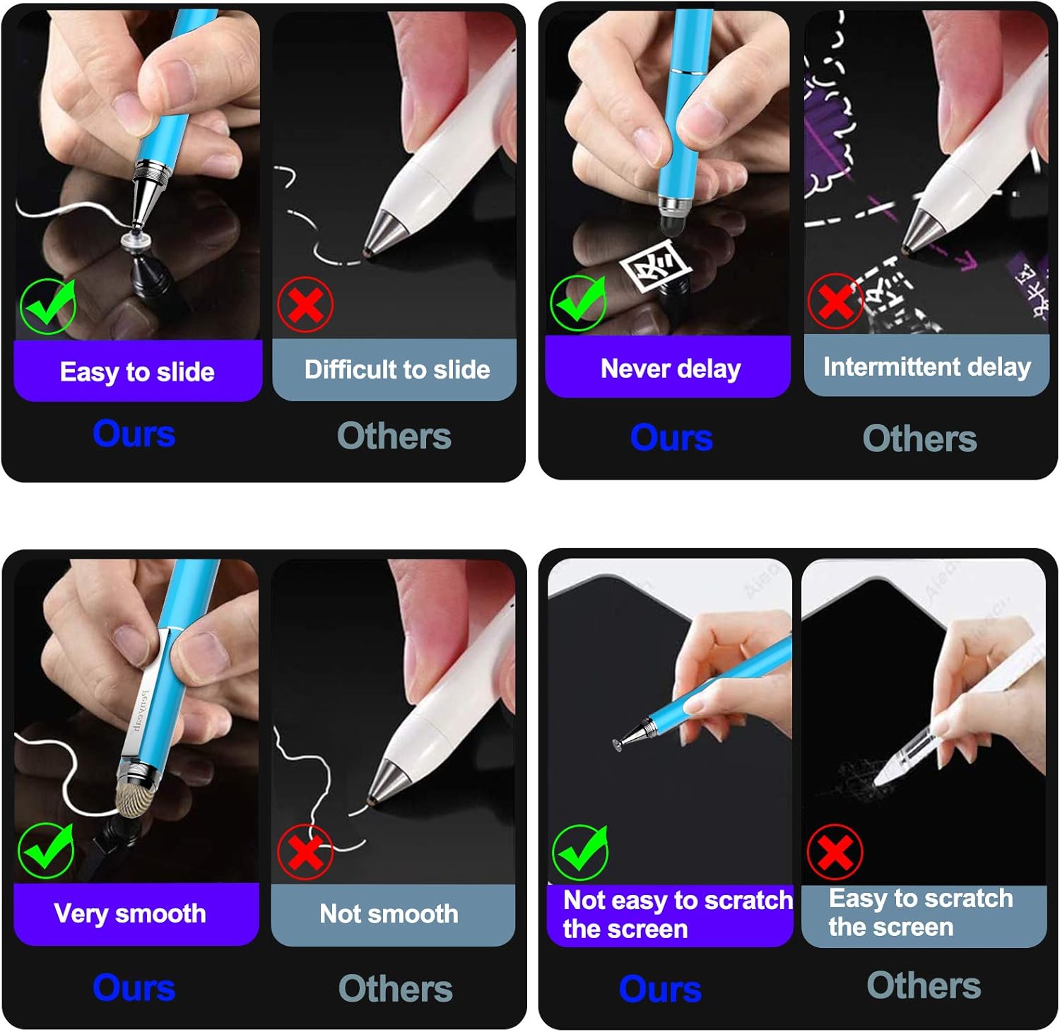 - ✔【4-in-1 UNIVERSAL】-- Penyeah Stylus Pens for touch screens include 4 different of touch screen replaceable tips: 1 X 0.27" clear disc tip; 1 X 0.23" mesh fiber tip; 1 X 0.16" rubber tip and 1 X 0.2 " rubber tip; plus a fine point black ink ballpoint writing pen. More functional than that of current similar styli. It 's your BEST CHOICE!