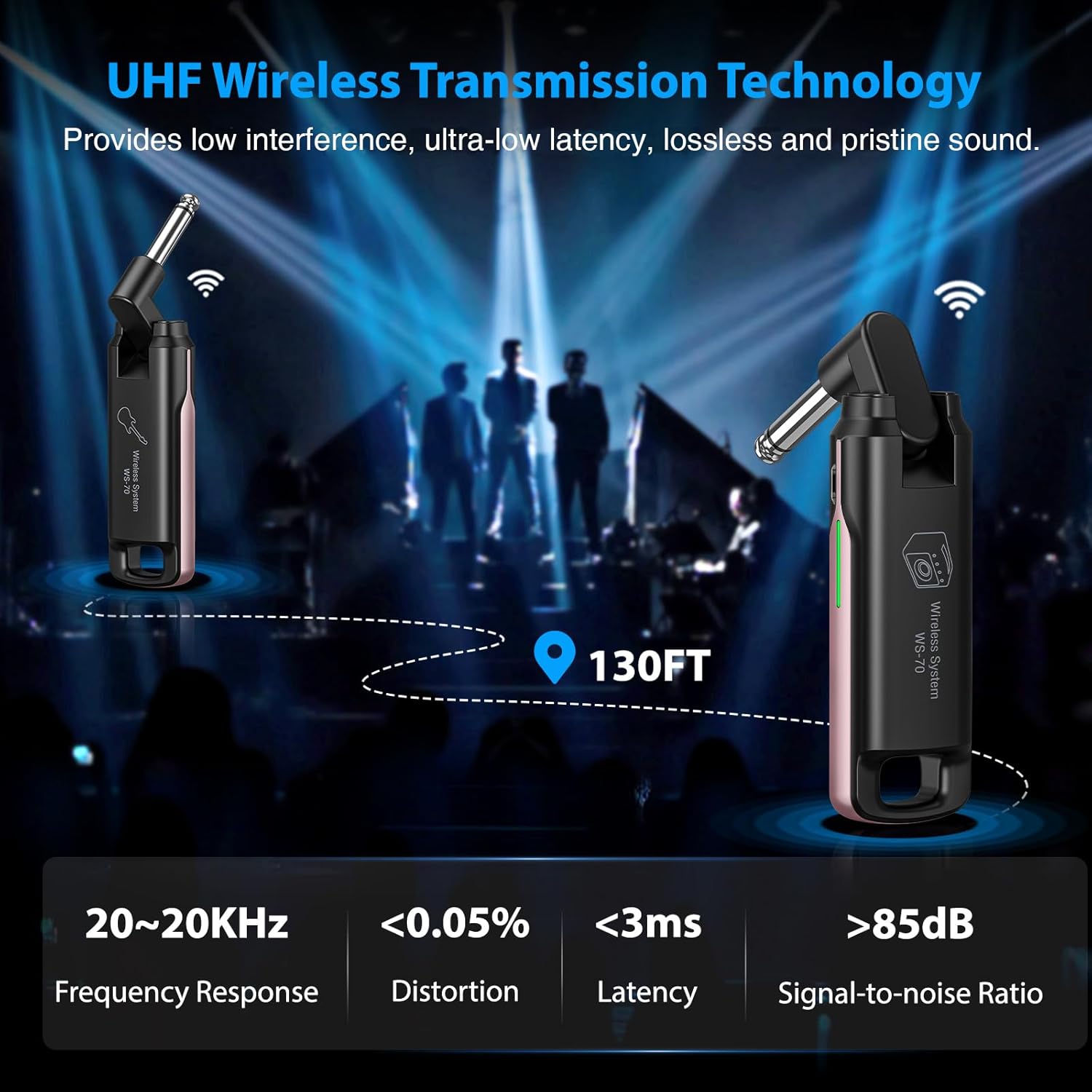 - Clear Audio Quality : The wireless guitar transmitter receiver adopts advanced UHF technology, high frequency which less than 3ms latency, no lag or no signal loss. effective range is about 100 feet. Strong anti-interference ability delivers great audio quality and stable signal