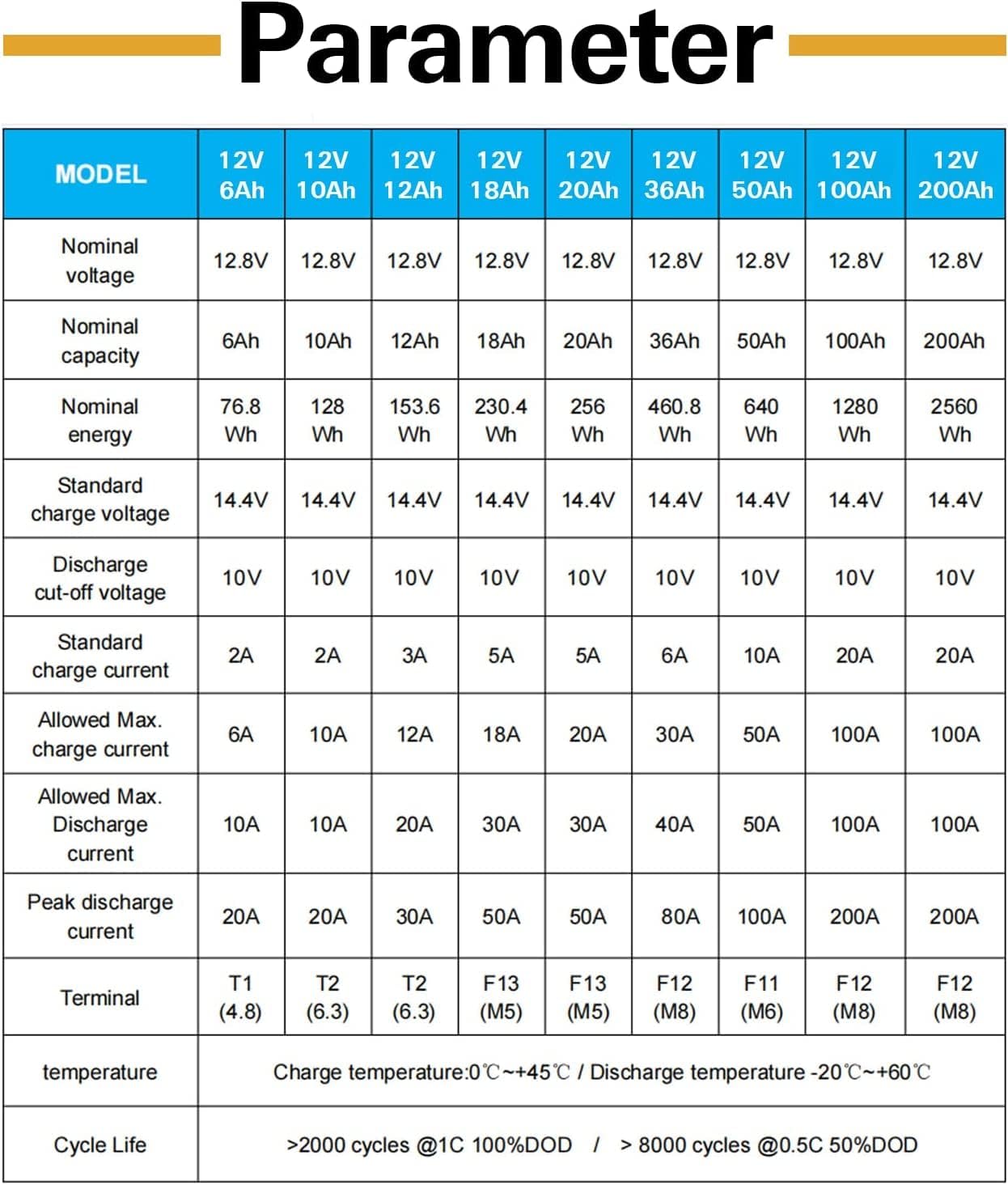 - BUILT TO LAST: Our 12V 50Ah LiFePO4 Batteries live more than 2000 cycles at 100%/8000 cycles at 50%(Suggested) depth of discharge, without decreasing in performance. The average lifetime of lead-acid batteries is about two years(500 cycles) at just 50% discharge. This basically means a LiFePO4 battery will last you at least 5 times longer than a lead-acid battery, which actually reduces overall cost.