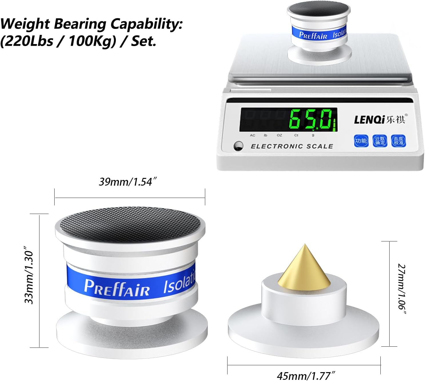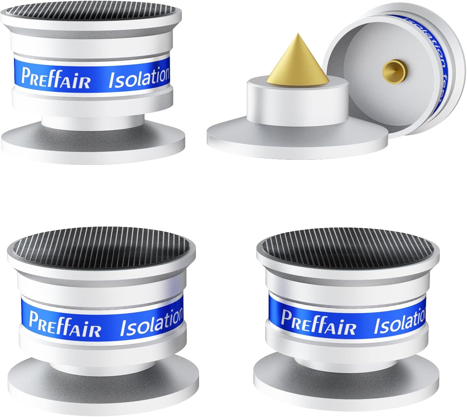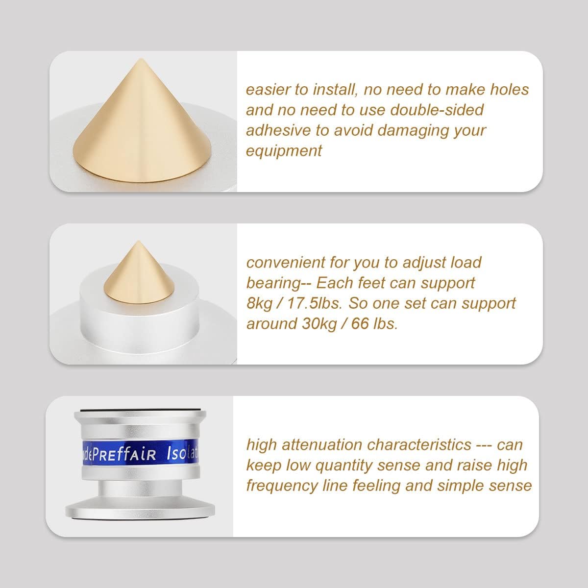 - ā Preffair High quality aluminium alloy speaker isolation spike with high hardness and density has low harmonic vibration point and high damping, managing the energy of the speaker to reduce vibrations resonating through the supporting surface and internal reflection to eliminate dissonant sound.