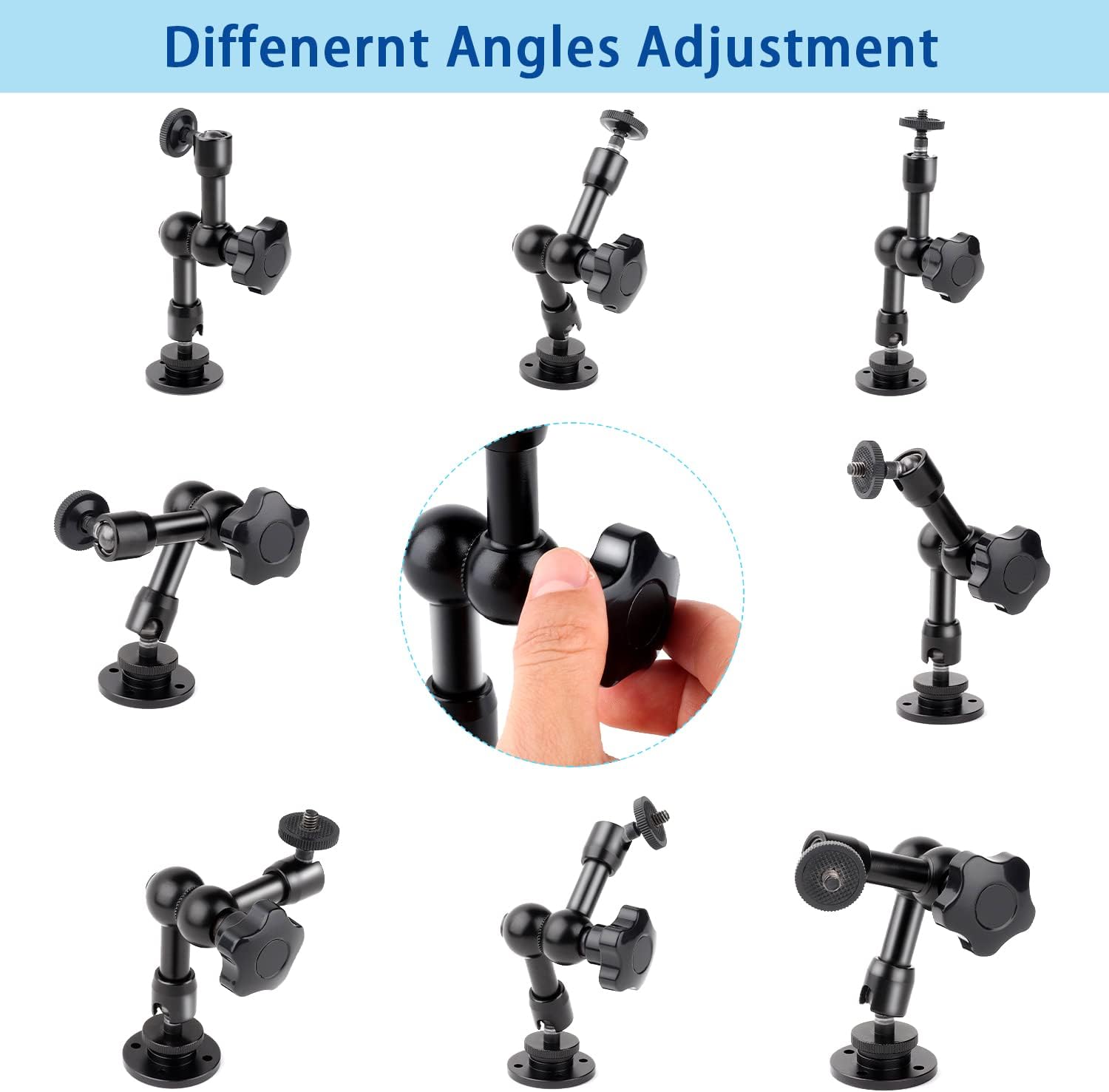 - 【Angle Adjustable】: Phone holder has 2 balls head at each end of arm,allowing 360° rotation and 90° tilt randomly by adjusting joint knob, keeping the arm locking and tighten to capture different angles view.