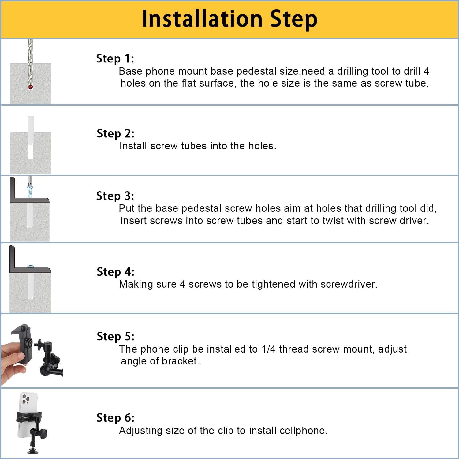 - 【Warm Reminder】: Package including one phone mount, one phone clip and screw parts. Any question with our product, please feel free to contact us and provide best solution for you.