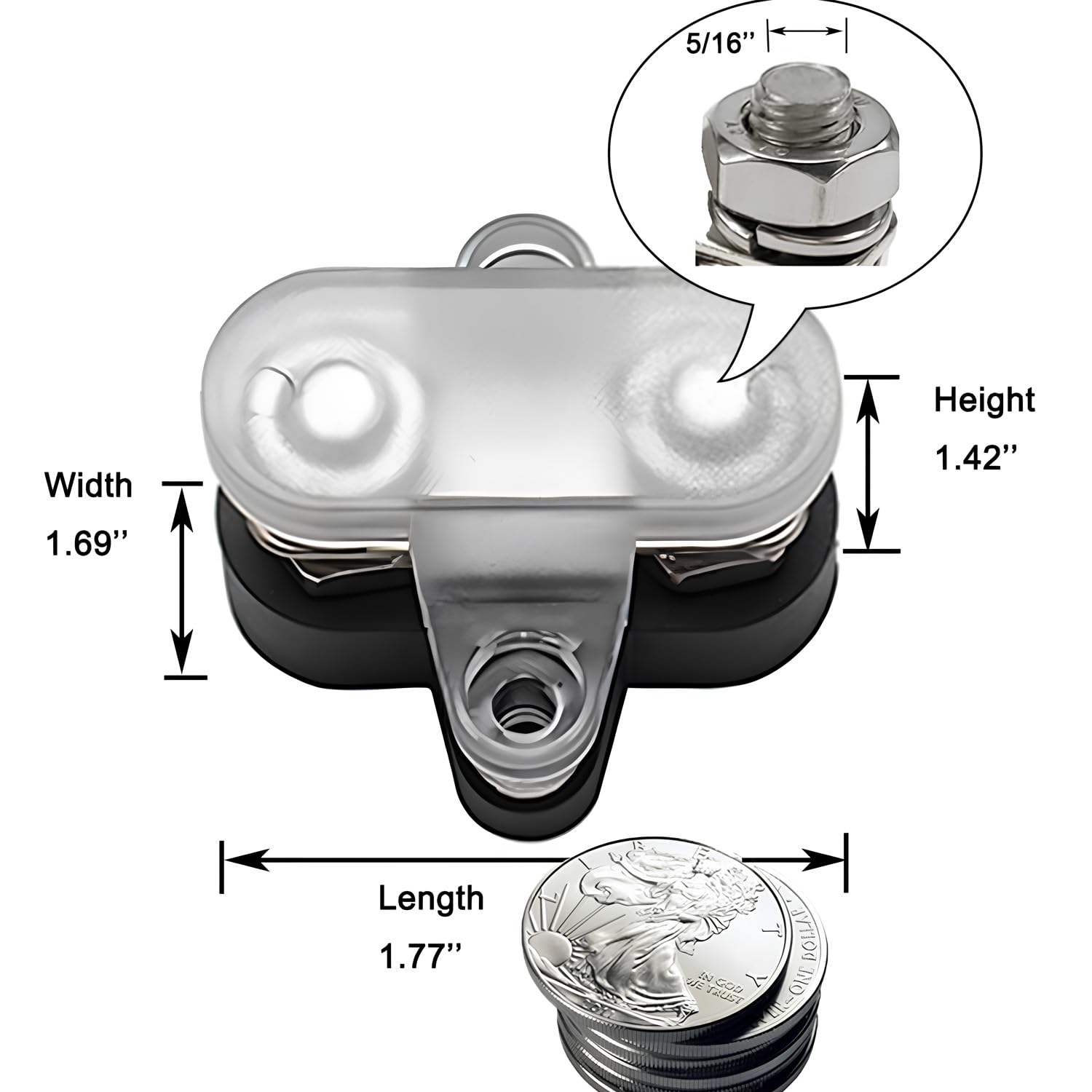 - WORKING RATING - Power stud size: 5/16".Maximum working voltage is DC 48V & up to 150 Amps.The battery bus bar is measured 1.77" x 1.69" x 1.4"