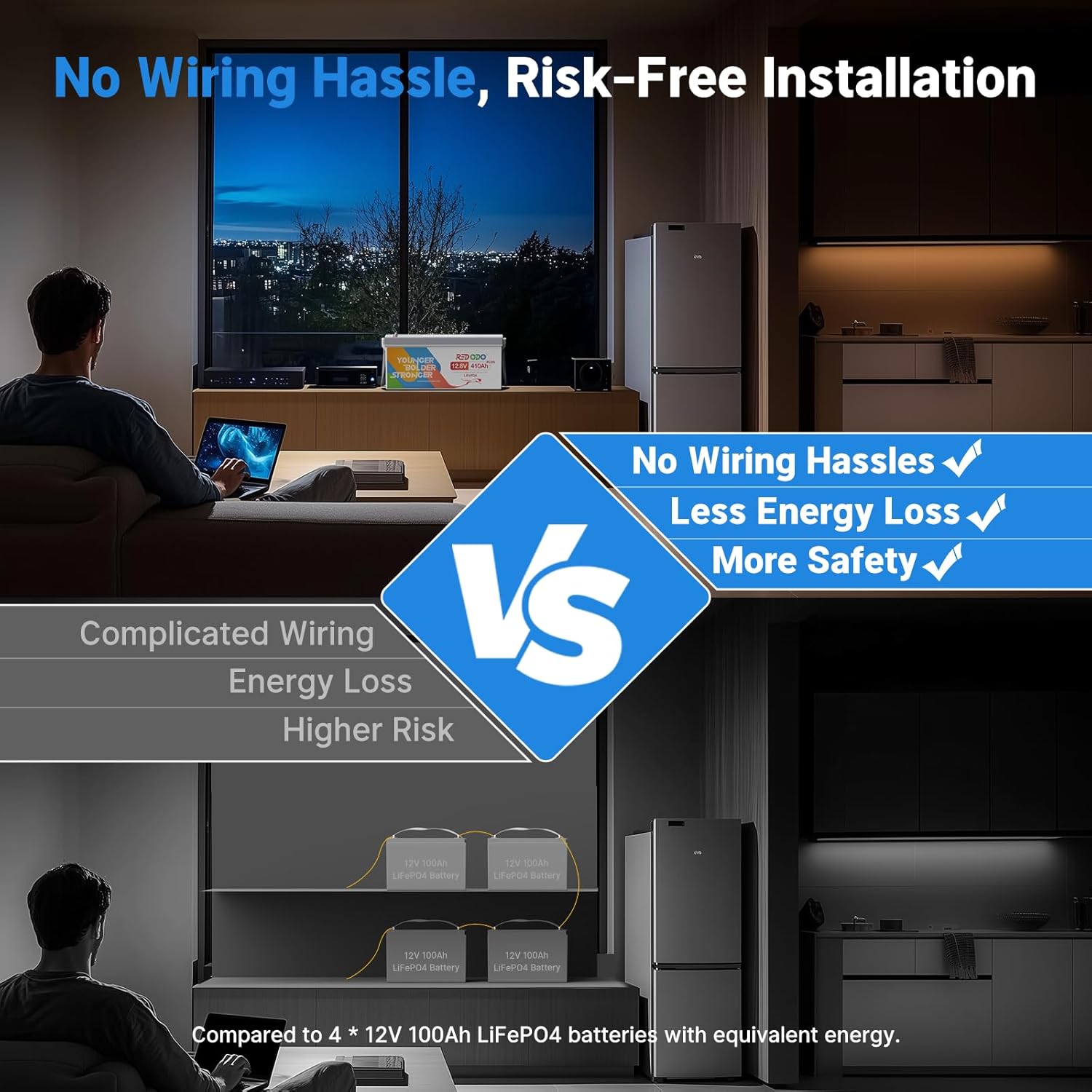 - ăPlug-and-Play SimplicityăA single Redodo 410Ah lithium battery replaces 4* 12V 100Ah lithium batteries with equivalent energy(5.12kWh), eliminating complex wiring, reducing energy loss, and improving safety.