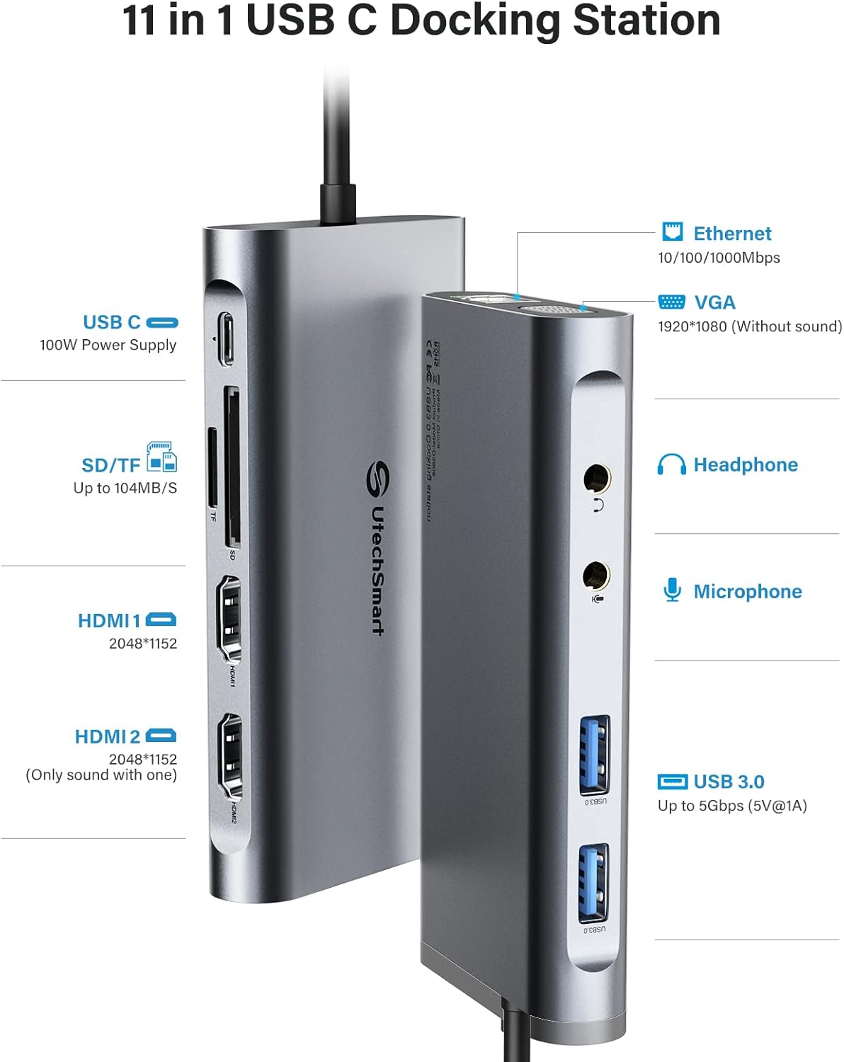 - [Plenty Connection Options] - UtechSmart universal docking station letās you charge your phone or other devices and transfer data by 2x USB 3.0(5Gbps, 5V, 1.5A), and keep expanding SD/TF card reader, Gigabit Ethernet, and 3.5mm audio in and out ports. Get a compact USB docking station like this, to fullfill all the functions what you need.