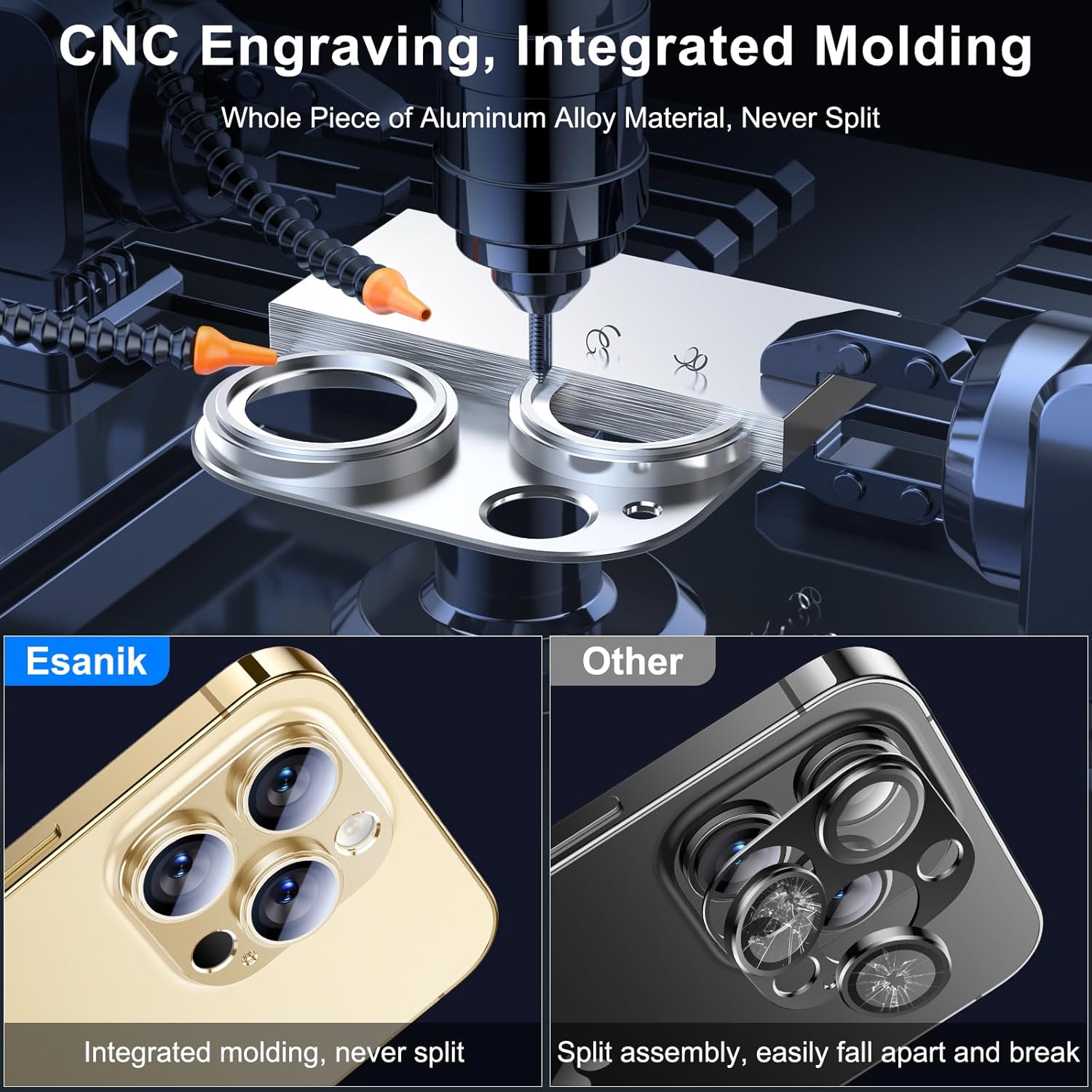 - ăCNC Engraving & Integrated Moldingă Esanik 2023 Upgrade Version iPhone 14 pro max / iPhone 14 Pro Cam Cover is precisely carved from whole piece of high-quality aluminum alloy, firm and long lasting. Bid farewell to the split and falling apart issues resulting from the conventional split assembly process.