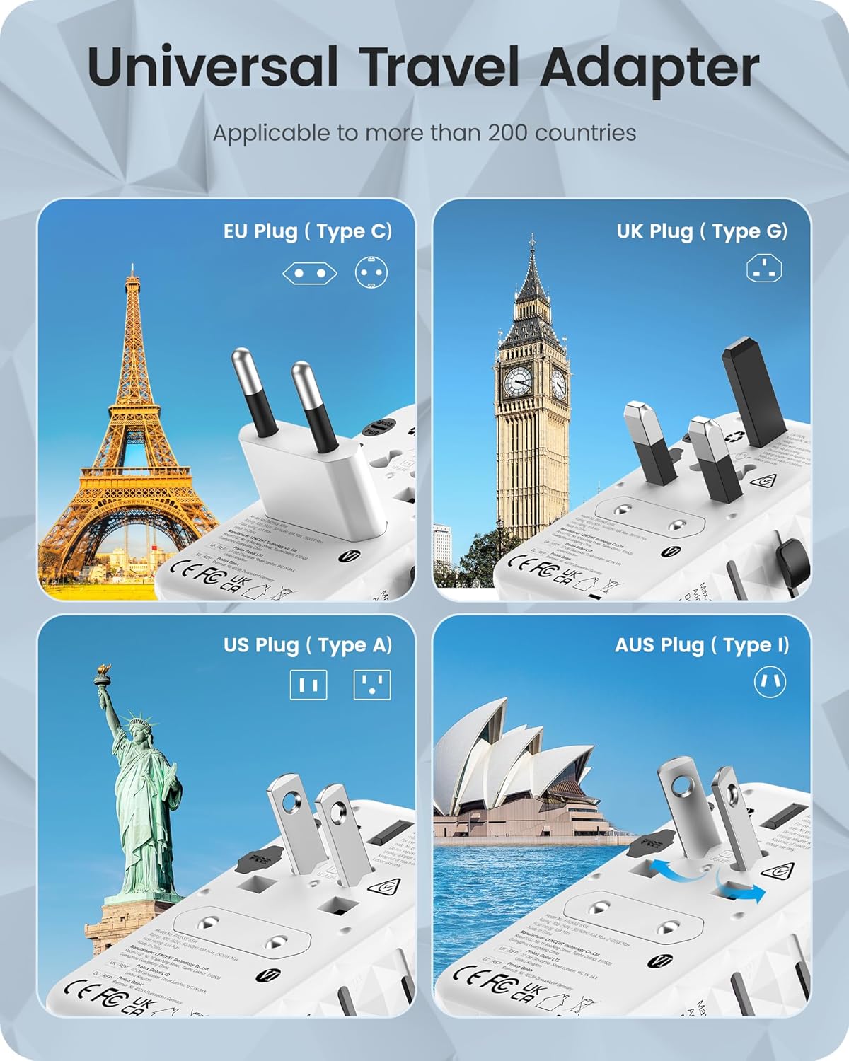 - International Travel Adapter: This travel adapter covers over 200 countries: Type C Plug: Most of Europe, France, Germany, Italy, Spain, Iceland, Greece, Israel; Type G Plug: UK, Ireland, London, England, Scotland, Dubai; Type I Plug: China, Australia, New Zealand; Type A Plug: USA, Japan, Canada