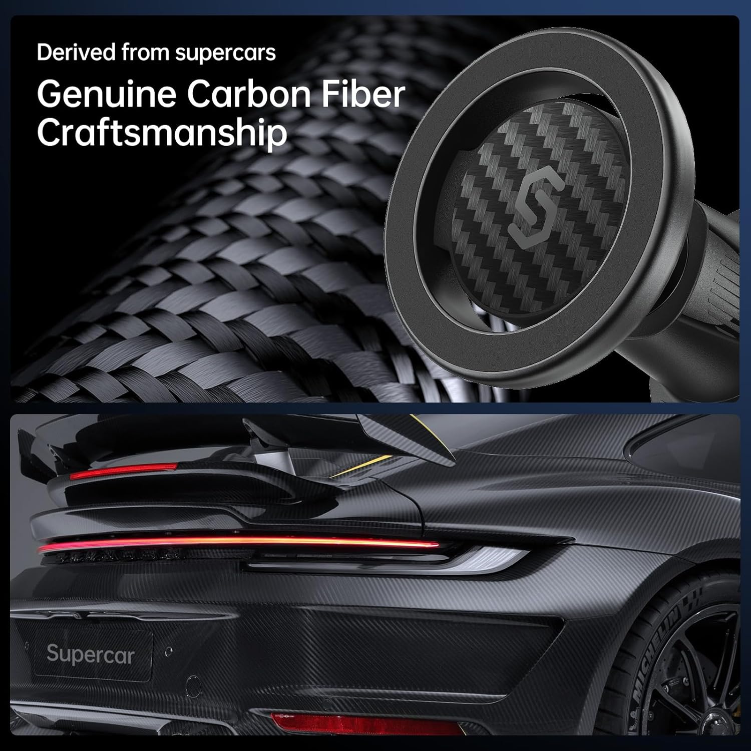 - ăGenuine Carbon Fiber CraftsmanshipăInspired by supercars, this MagSafe car mount is designed to seamlessly complement your luxury car. Unlike other car mounts on the market, SYNCWIRE's car mount is crafted from high-quality genuine carbon fiber material, seamlessly blending aesthetics and luxury, ensuring the ultimate experience in both visuals and usability.