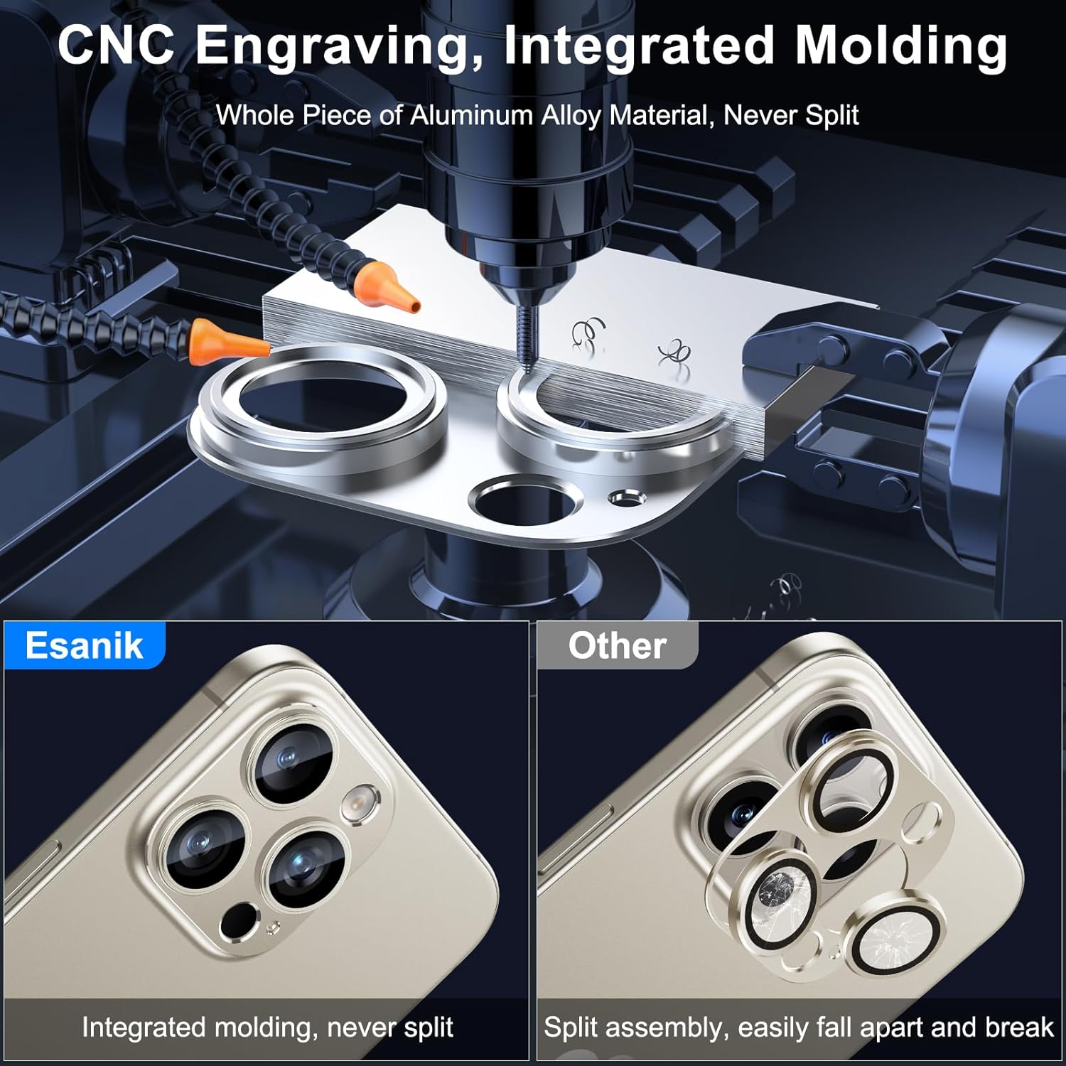 - ăCNC Engraving & Integrated Moldingă Esanik 2023 Upgrade Version iPhone 15 pro max / iPhone 15 Pro Cam Cover is precisely carved from whole piece of high-quality aluminum alloy, firm and long lasting. Bid farewell to the split and falling apart issues resulting from the conventional split assembly process.