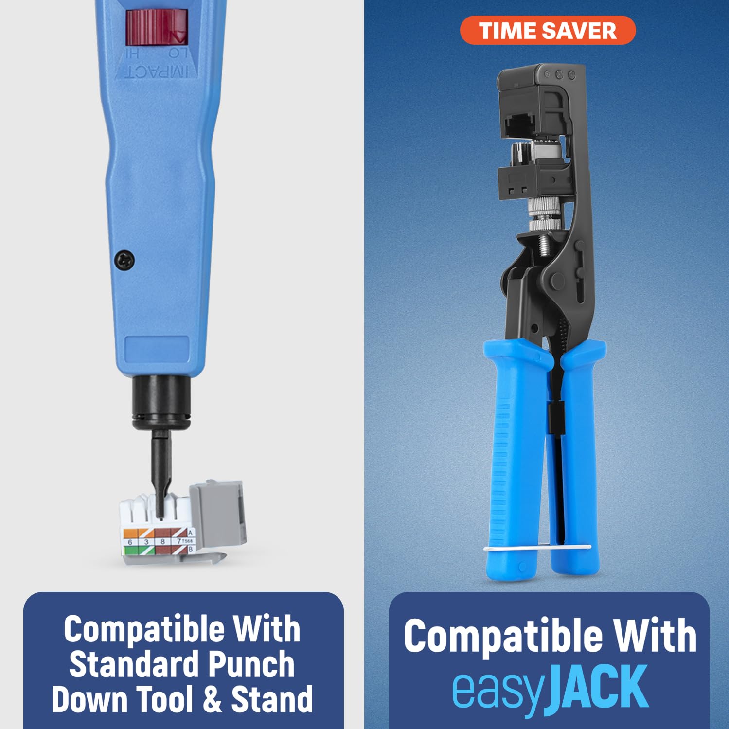 - Compatibility - compatible with our 90 degree angled speed termination tool - easyJACK (B094WB91H3). These cat 6a jacks keystone rj45 can also work in conjunction with a standard punch down tool and punch down stand for convenience.