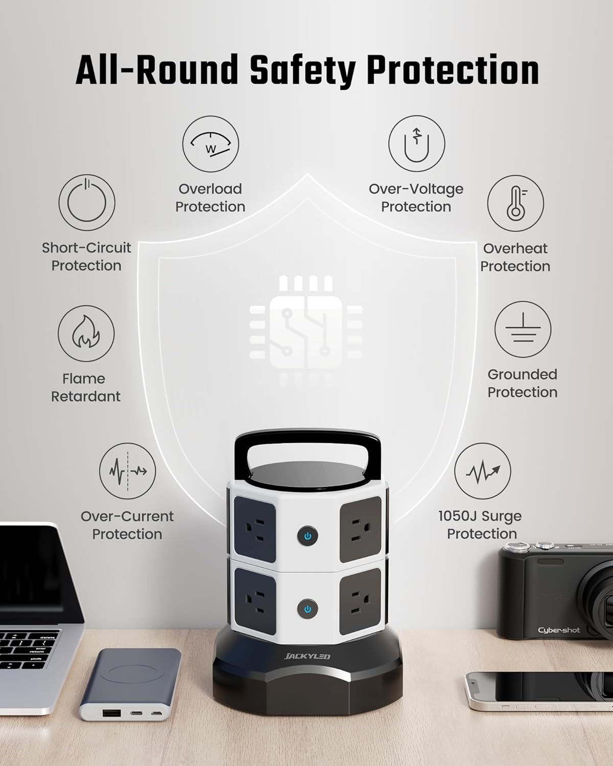 - ▶【2 USB-C & 2 USB-A Charging Ports】Tired of searching for adapters when the phone battery is low? With 2 USB-C ports and 2 USB-A ports, JACKYLED USB power strip tower is here to simplify your charging needs. The inbuilt smart charging technology empowers the USBs to intelligently detect your electronic devices and charge them at optimal yet safe speeds—compatible with most USB devices. (USB-C: 5V⎓3A, USB-A: 5V⎓2.4A)