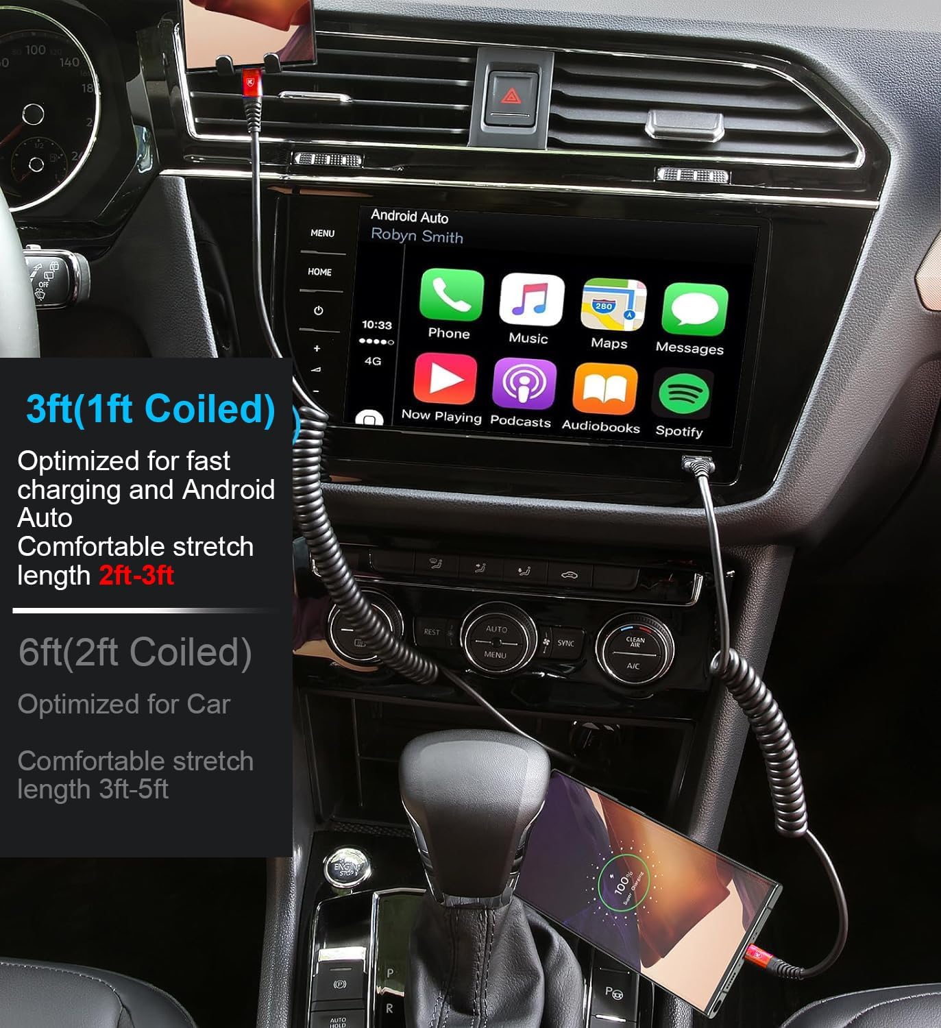 - USB C to USB C Cable Fast Charging for Car: Coiled type c car charger with spring shape design, portable and not tangled. It can well save the use of space in the car and say goodbye to the hassle of data cable clutter and tangles.