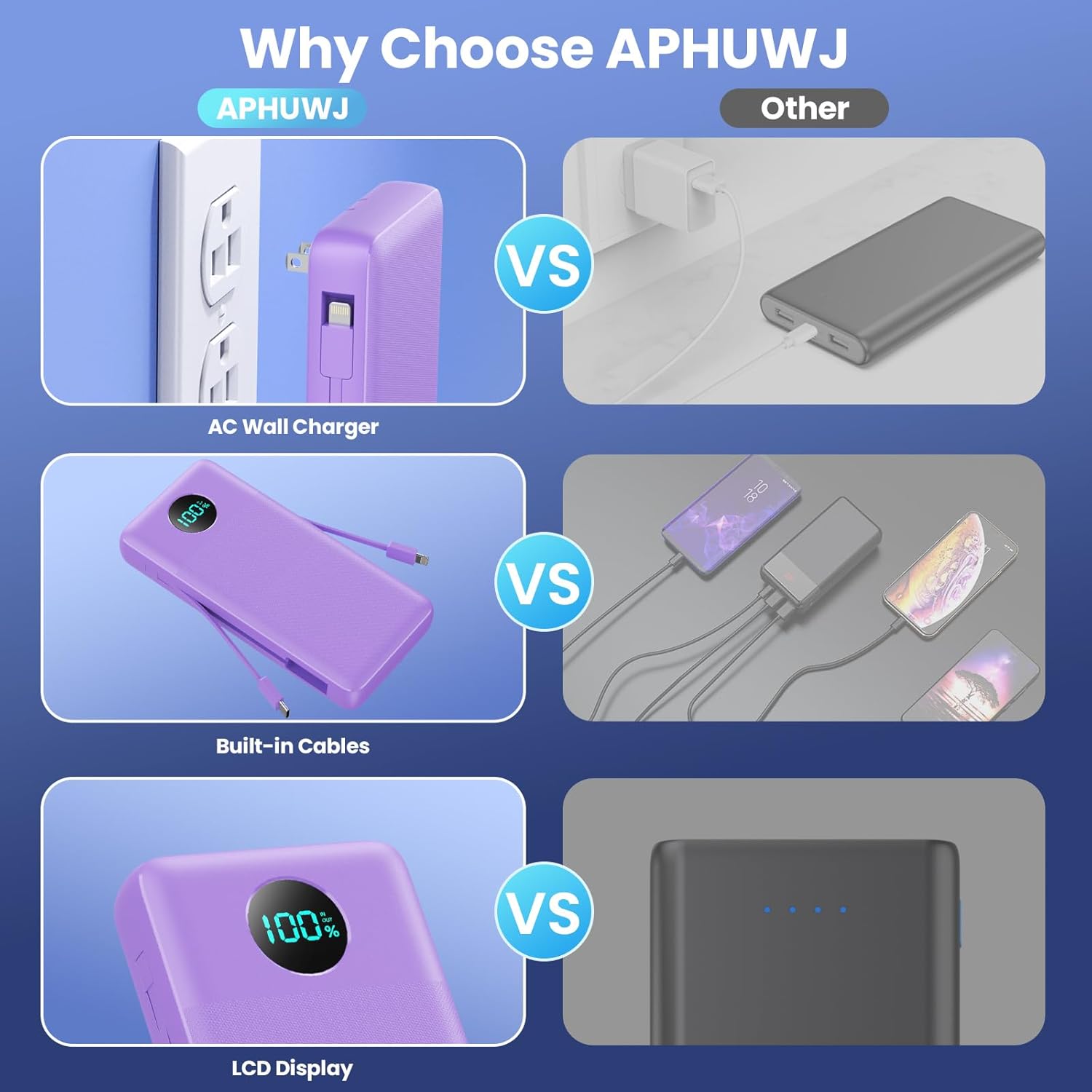 - Import Intelligent Controlling IC & LCD Display: The portable charger adopt Import Intelligent Controlling IC to prevent power bank overcharge, overvoltage, overcurrent and short circuit. make sure product quality is safer. It comes with a display on the front to indicate the remaining battery level, so you can be aware of and recharge the charging bank portable charger in time.