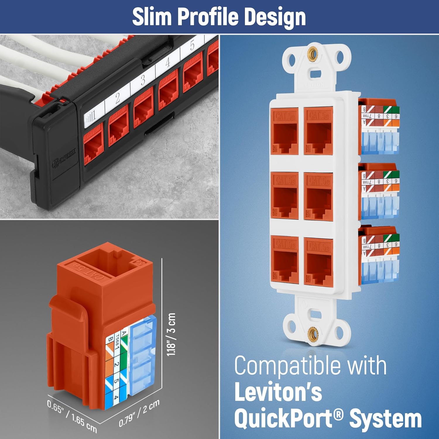 - Slim Profile Design - Can be used with a Keystone patch panel, wall plate, or surface mount box with standard or slim keystone blank openings. compatible with Leviton QuickPort System and slim Decora style wall plates