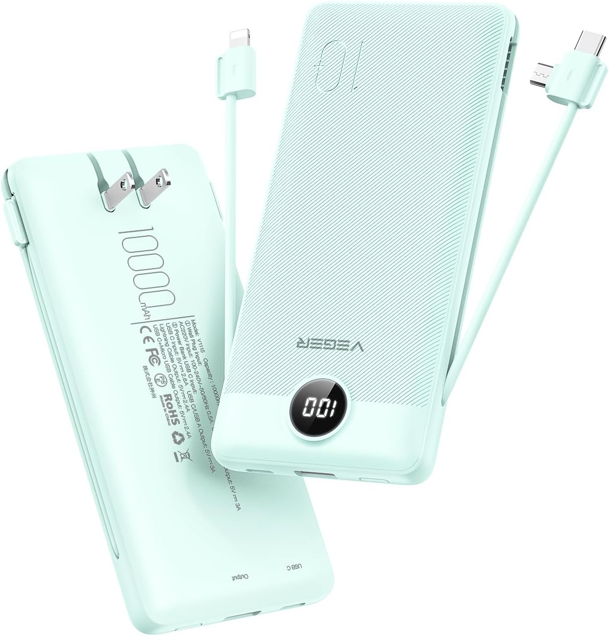 - 【Portable Charger with Built in Cables &Plug】 VEGER 10000mAh Portable Charger, with built-in USB-C , other cable for iPhone, and a Wall Plug for recharging the power bank itself, you can say goodbye to carrying adapters and cables when travel.