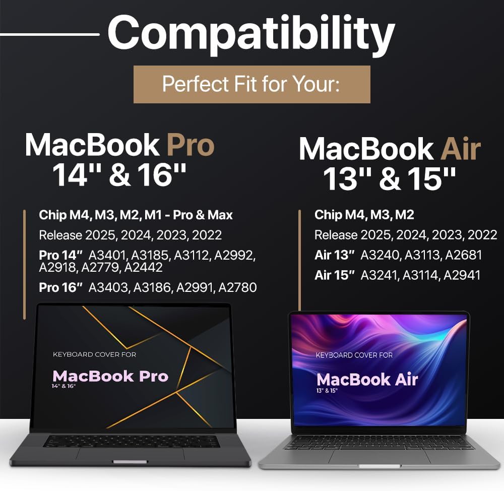 - Perfect Fit for Latest MacBook Models: MacBook Pro 14 inch keyboard cover M4 and MacBook Pro 16 inch keyboard cover M4 Pro Max. Perfectly works as MacBook Air 13 inch keyboard cover M4 M3 and MacBook Air 15 inch keyboard cover as well.