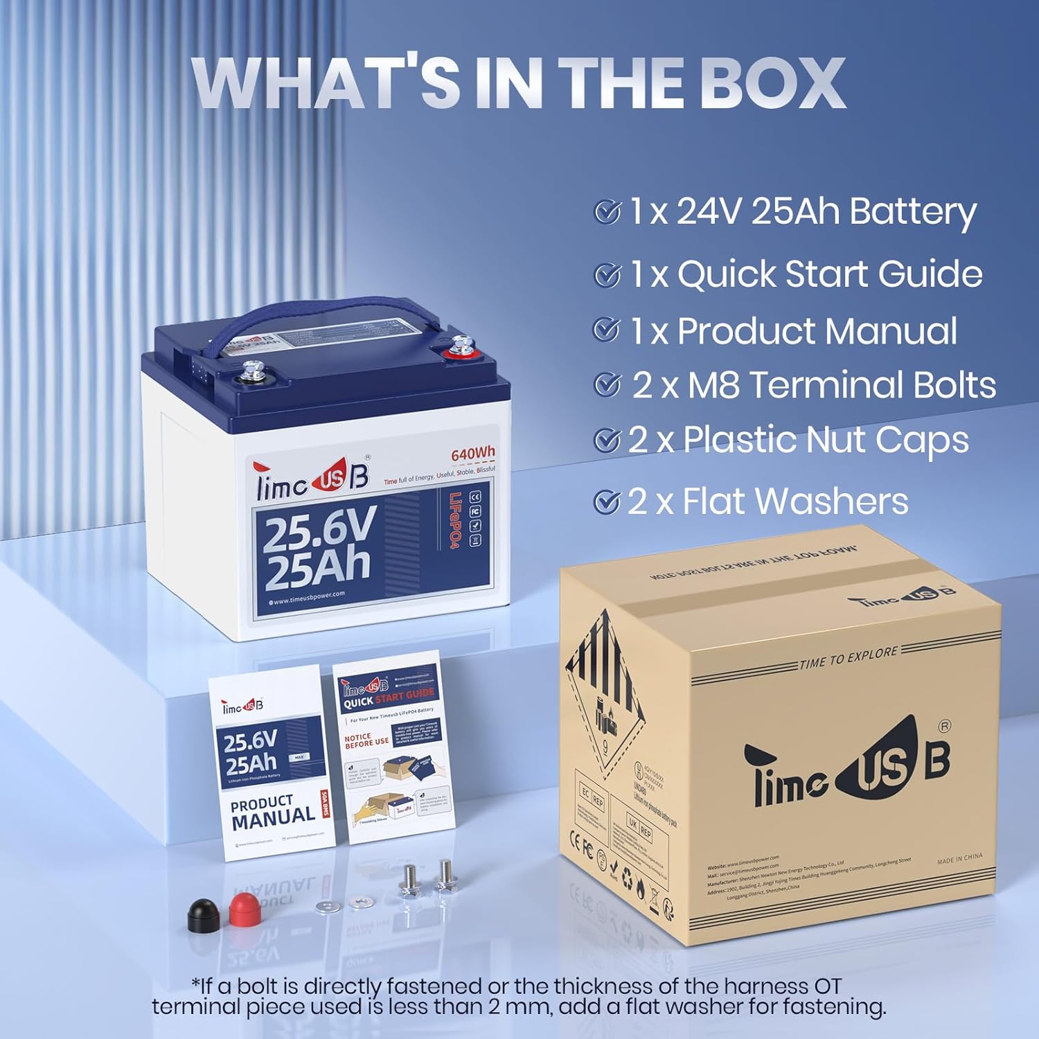 - ăAdvanced Grade A Cells & 50A BMSă Timeusb 24V 25Ah LiFePO4 battery is built-in 50A advanced BMS to protect it from over-charging, over-discharging, overcurrent, short circuit, high-temperature.The 24V 25Ah lithium battery adopts automotive-grade battery cells in an ideal battery cell structure allowing it to perform up to 15000 deep cycles & 10-year longevity. Timeusb LiFePO4 batteries are rated for over 4000 cycles at 100% DOD, over 6000 cycles at 80% DOD and up to 15000+ cycles at 60% DOD.