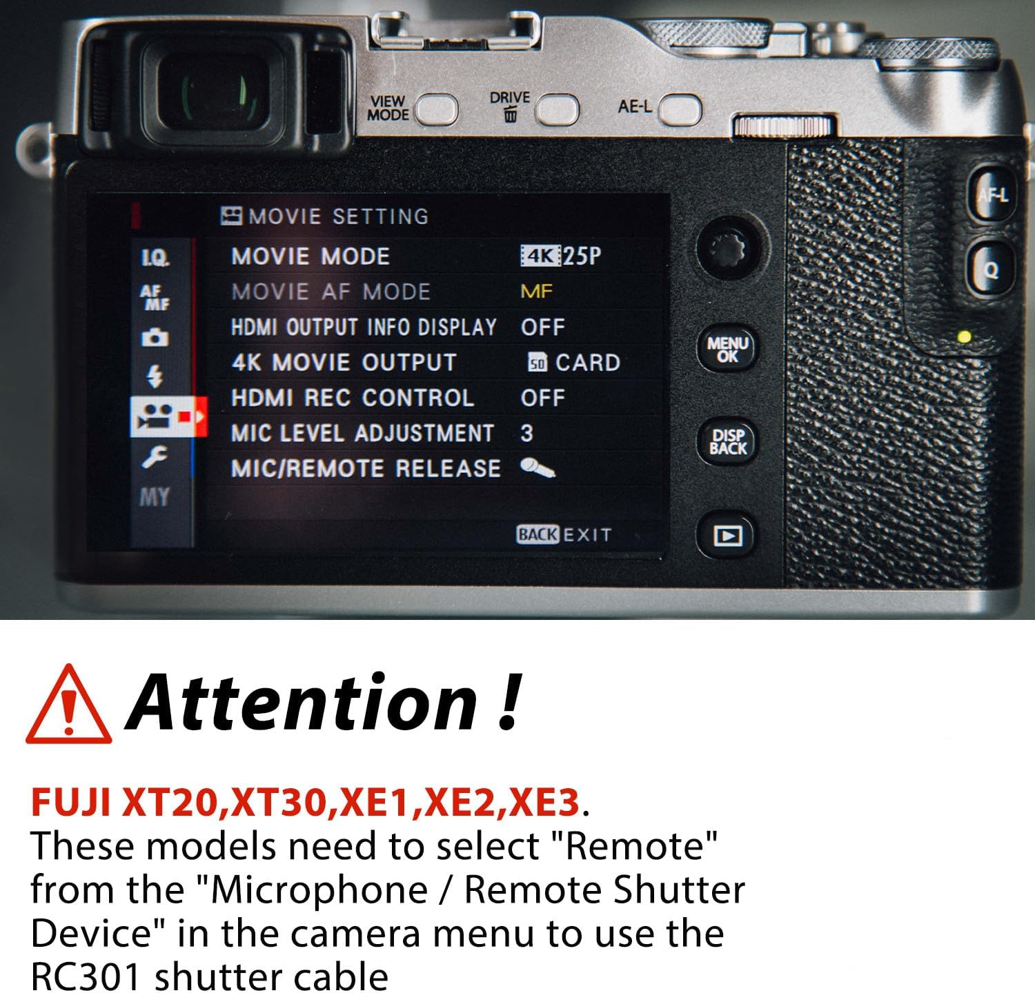 - 4.Be careful !Fuji's fast door is on the right side of the camera (above the storage card / SD/TF card), printed with letters - REMOTE