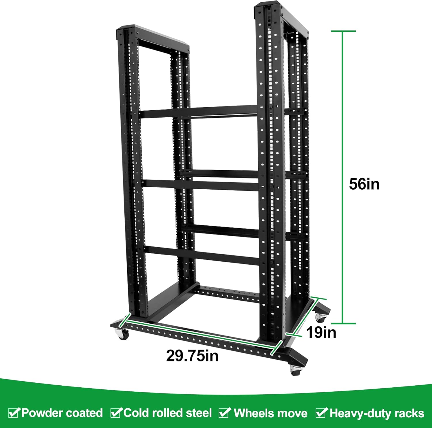 - Specifications:GLOBALRACK 4-post open frame server rack ,Network rack that complies with all 19-inch standard equipment.Installation depth 29.75-27.75in,Equipped with brake wheels,Compatible with various servers, switches, data, AV, other IT equipment.