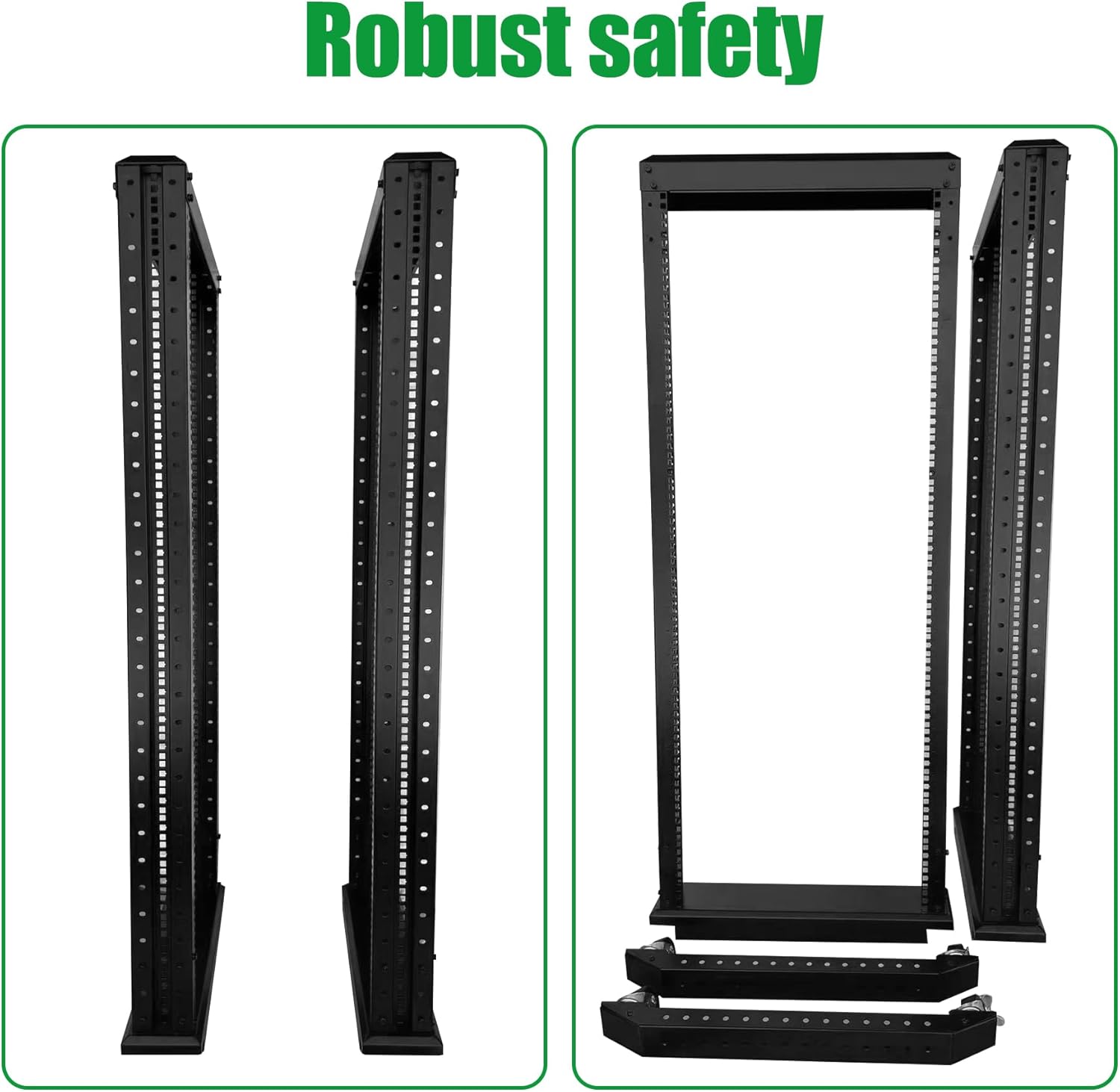 - COLD ROLLED STEEL RACK:Free Standing Rack, Very stable,Each server rack is equipped with three pairs of L-shaped mounting brackets(Support track) to secure your equipment,The bottom wheel extends outward to protect against tipping of the frame caused by uneven equipment weight, Ensuring your equipment is 100% safe. Premium quality craftsmanship, With supporting heave duty over 1850LBS Capacity, The thickness of the column steel plate reaches 2MM (0.08 inch).The battery module can be fully supported.