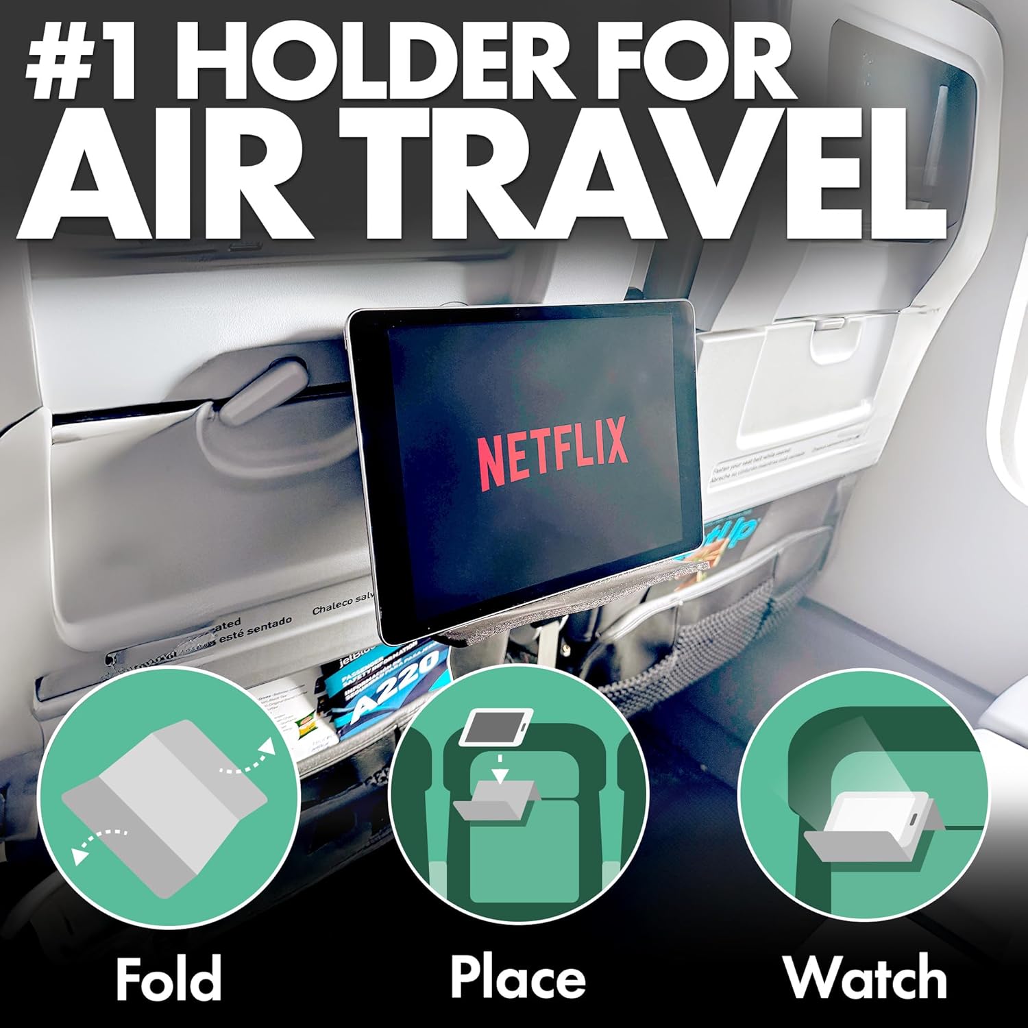 Airplane Tablet Holder, Extra Large 12x7” Flexible Cell Phone and Tablet Holder, Folding Cellphone Stand for Desk, Kindle, Bed, Long Flight Travel Accessories, Plane Essentials (Black)