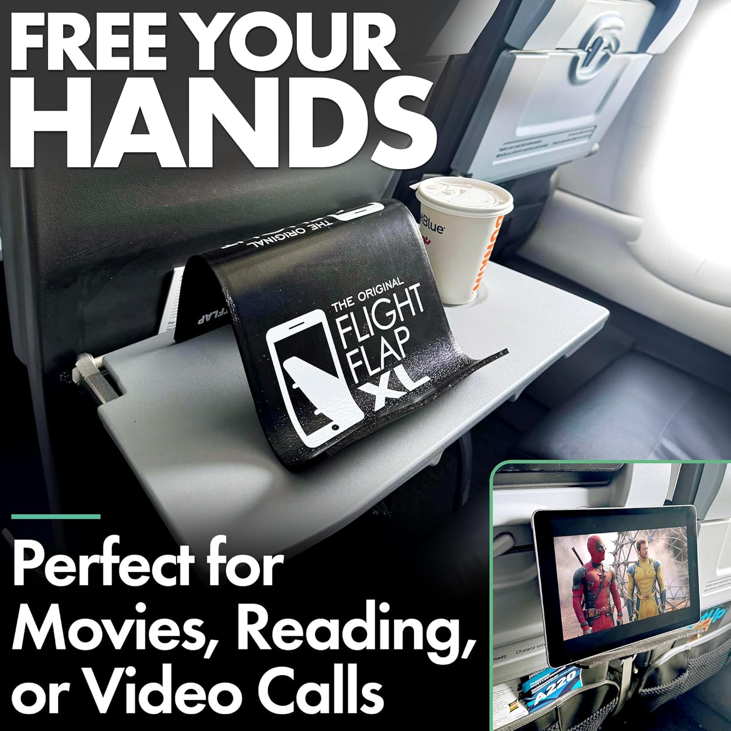 - USE FOR TRAVEL, WORK & LEISURE – Great for watching movies, entertaining kids, streaming workouts, hosting a zoom video call, or cooking with recipes on your phone. Use the FLIGHT FLAP XL's tablet stand desk anywhere to grip your device and view your content comfortably. Attaches to most airline seat backs and tray tables. During car rides, attach behind the headrest and stream movies for kids. Properly positions your phone or tablet to host zoom meetings.