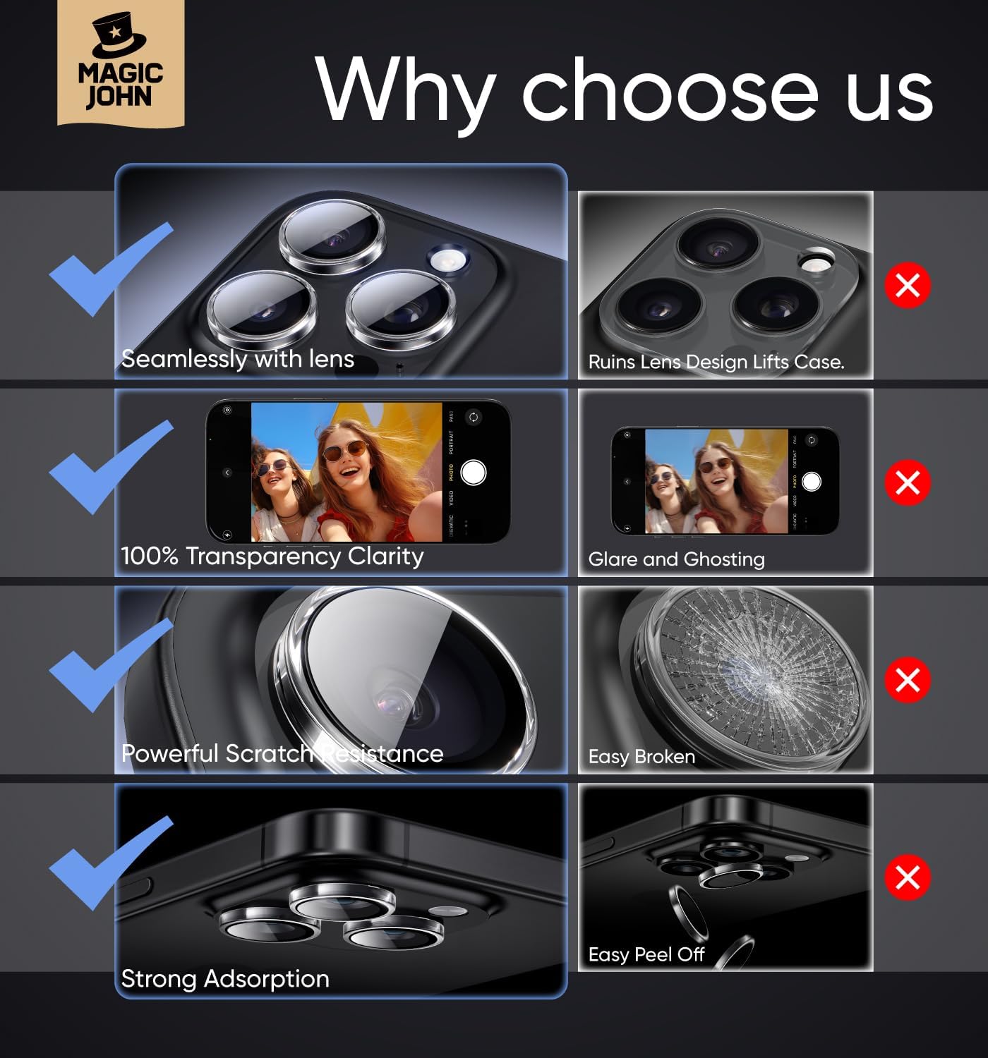 - [High-reduction Photography] MAGIC JOHN camera lens protector with upgraded sapphire material, 99.99% optical-grade light transmittance, AR anti-reflection technology which produces the same shooting results as the original iPhone 16pro/16promax camera.