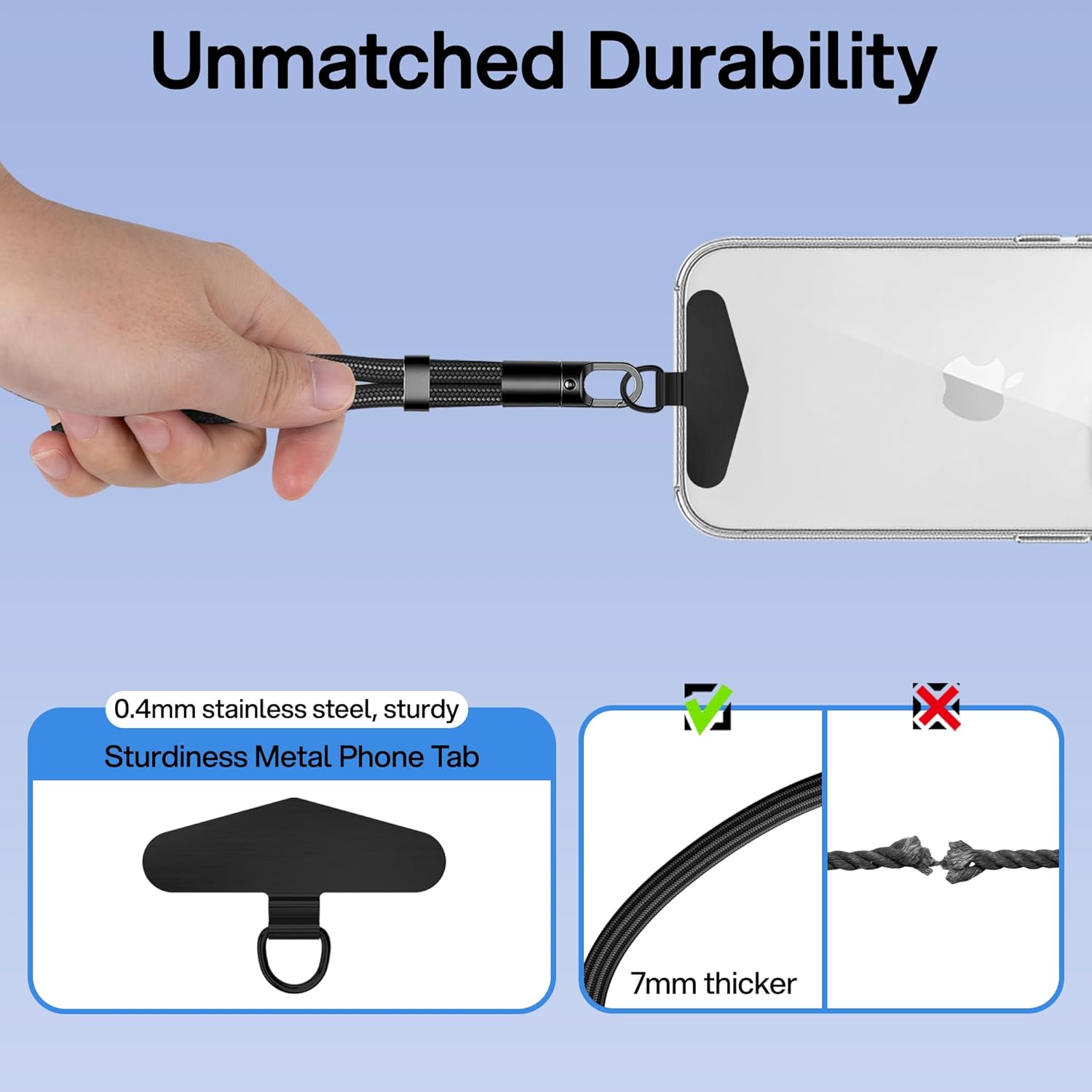 - 【Durability 】 Includes phone tether. Crafted from strong stainless steel, our heavy duty metal phone tether tab is stronger and more durable than standard phone tabs. Slim, lightweight and no interference with charging , it can support up to 10KG.