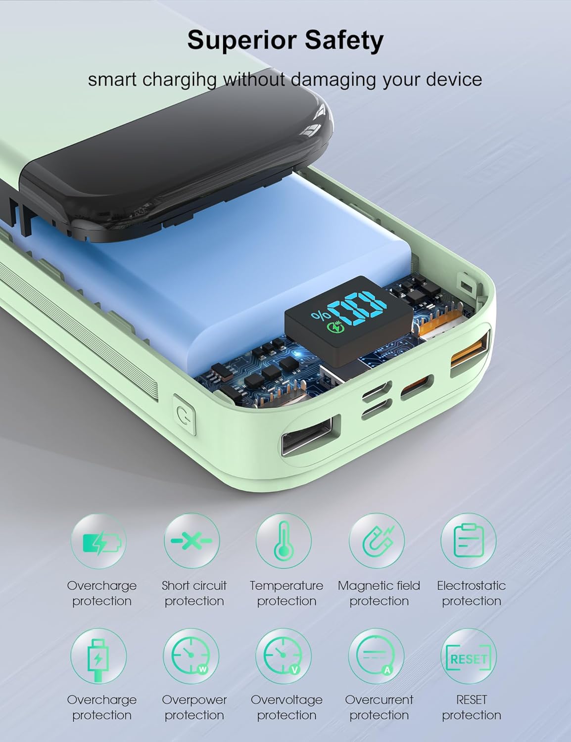 Portable Charger Power Bank 32000mAh with Built in Cables, PD3.0 USB C Fast Phone Charger, 5 Outputs LCD Display Travel Battery Pack Compatible with iPhone, Samsung All Cell Phones (Green)