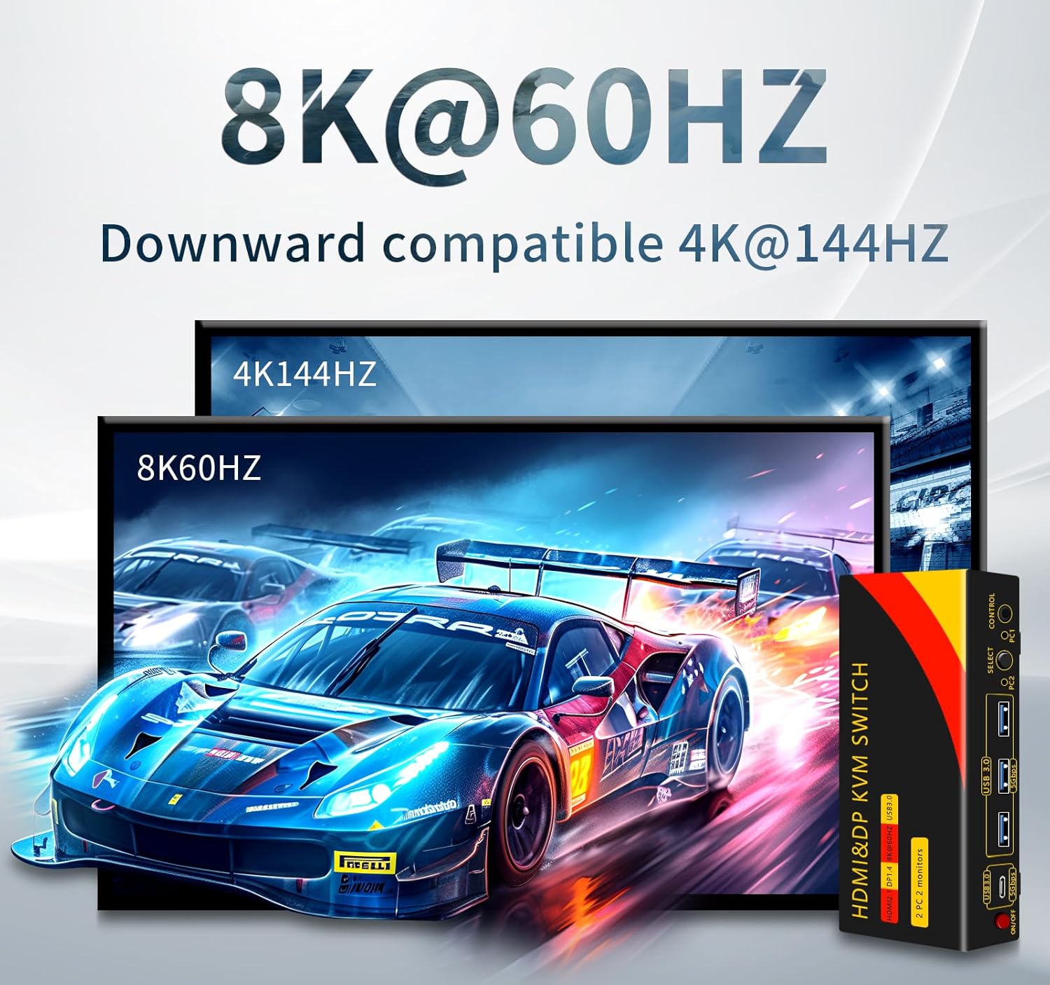 - ăUltra HD 8K@60Hz ăThese dual-monitor KVM switches support up to 7680*4320@60Hz and are backward compatible with 4K@120HZ, 2K@144HZ and below. Supports HDMI2.1 and DP1.4 standards. (Note: To achieve the highest resolution, you must ensure that the source and monitor as well as the HDMI and Displayport cables support 8K@60Hz), it is recommended that all connecting cables are no longer than 1.5 meters and that the output resolution of both computers is set to the same.