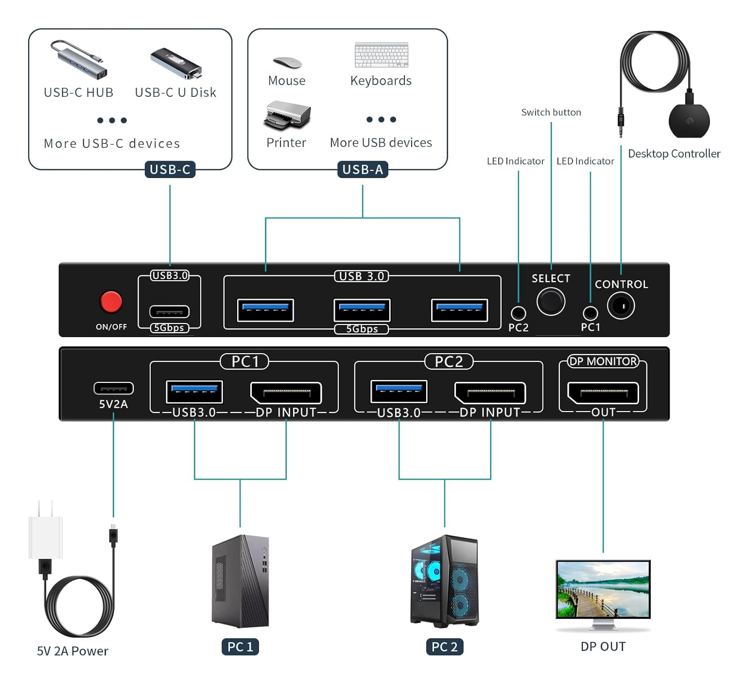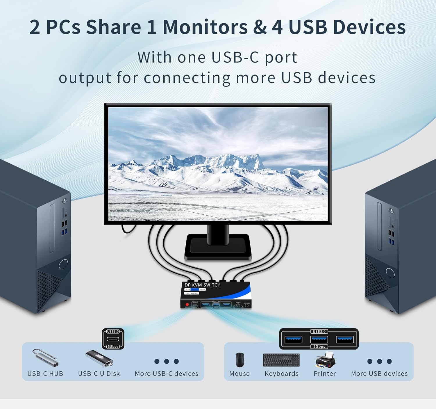- 【4 USB 3.0 Ports(3*USB-A& USB-C)】The KVM switch is equipped with 4 USB 3.0 (3*USB-A and 1*USB-C) ports with data transfer speeds of up to 5Gbps, as well as USB-A and USB-C ports for connecting more USB devices. Peripherals such as mouse, keyboard, printer and USB camera can be seamlessly shared between two computers. Note: USB-C only supports data, not audio/video transfer.