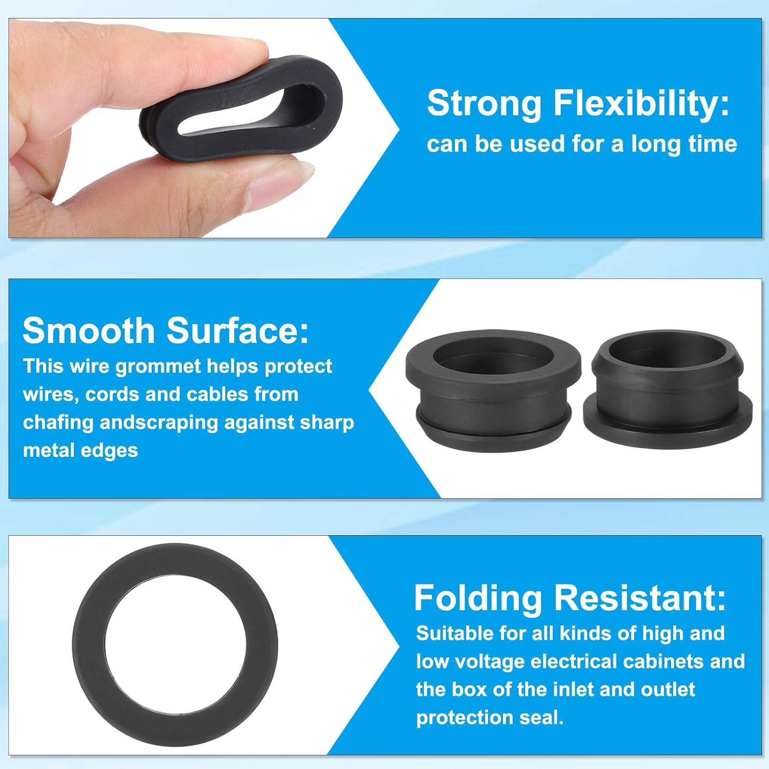 - Advantage: The rubber grommets are made of silicone rubber, which is flexible, durable, folding resistant, and has a strong insulation protection function. It is designed to protect wires from chafing and wear when passing through holes and it can be used for a long time to solve the problem of long-term wire protection and can be used to manage and route cables in a neat and organized fashion.