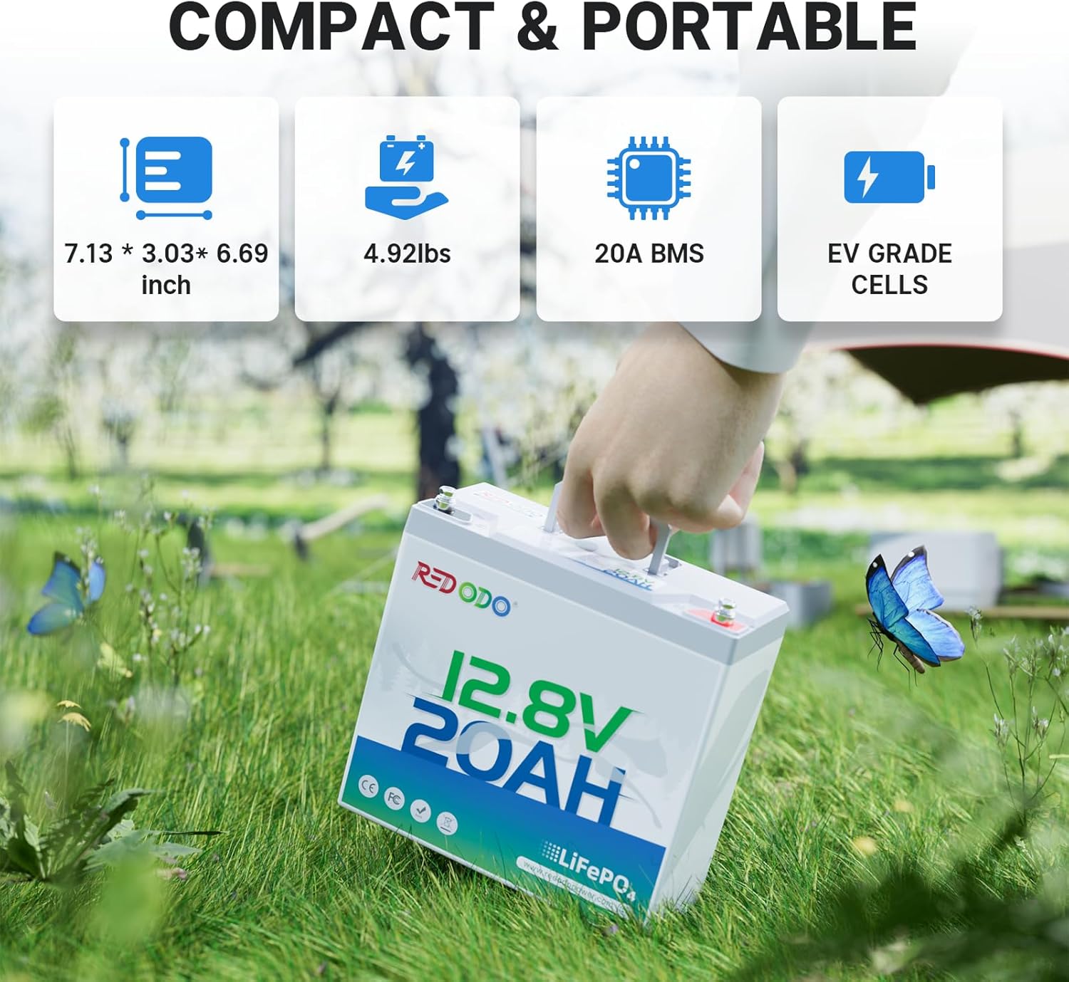 - 【1 hour Fast Charge】12V 20Ah Lithium Battery uses a Redodo 12V 20Ah charger, which can be fully charged in 1 hour. Wait less, explore more.