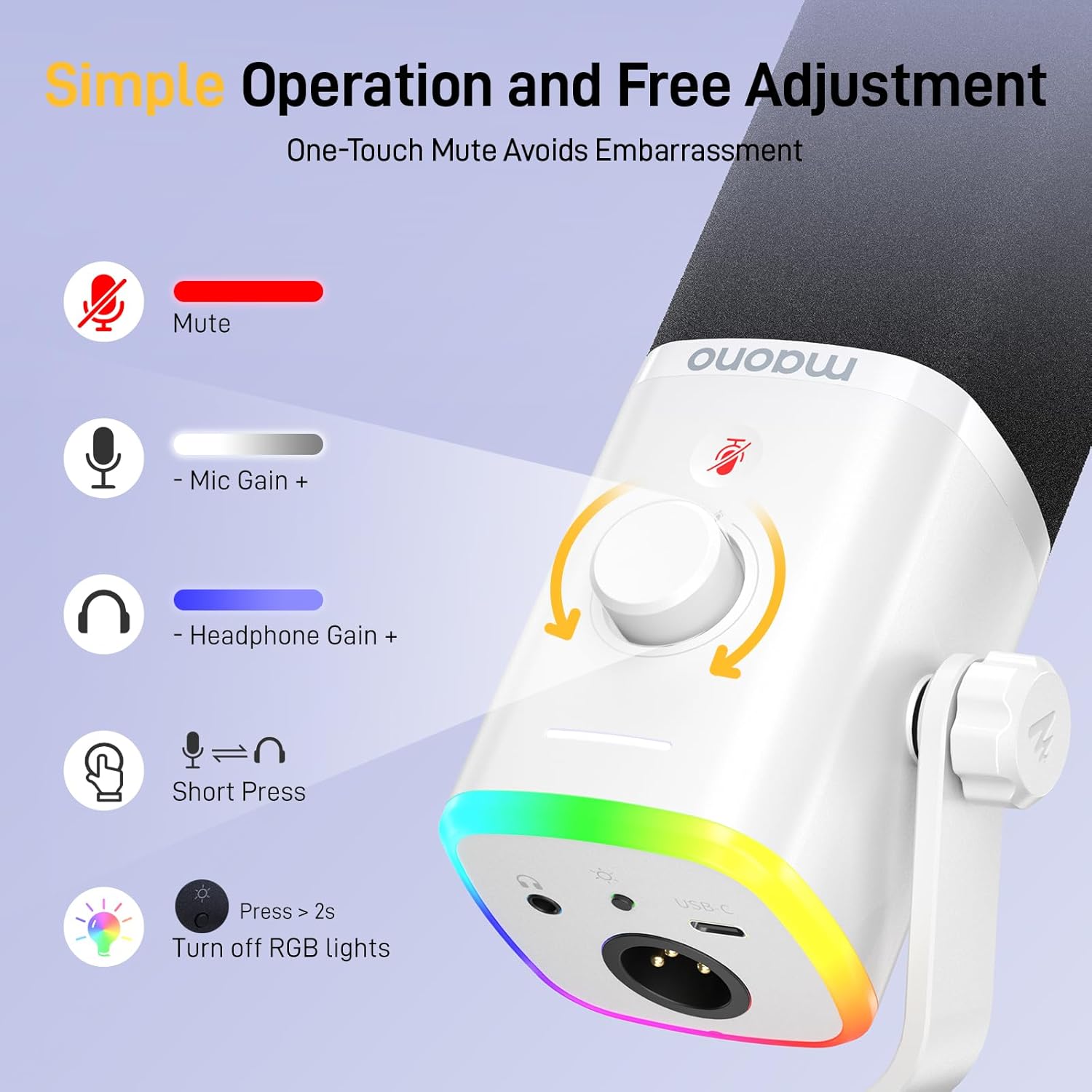 - Special Feature : Maono Link Software, Mute Function, Headphones Jack, Monitoring Volume Control, Buitin 3/8" and 5/8” Threads, RGB Lights, Noise Reduction, Volume Control, XLR/USB Connection Maono Link Software, Mute Function, Headphones Jack, Monitoring Volume Control, Buitin 3/8" and 5/8” Threads, RG… See more