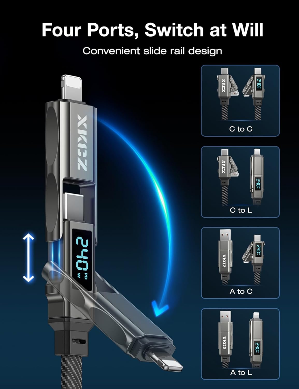 - Special Feature : 240W Fast Charging, 4 in 1 Versatile Cable, Flat Anti-tangle Nylon Braided, Real-time Power LED Display, TITAN Alloy Shell 240W Fast Charging, 4 in 1 Versatile Cable, Flat Anti-tangle Nylon Braided, Real-time Power LED Display, TITAN Alloy Shell