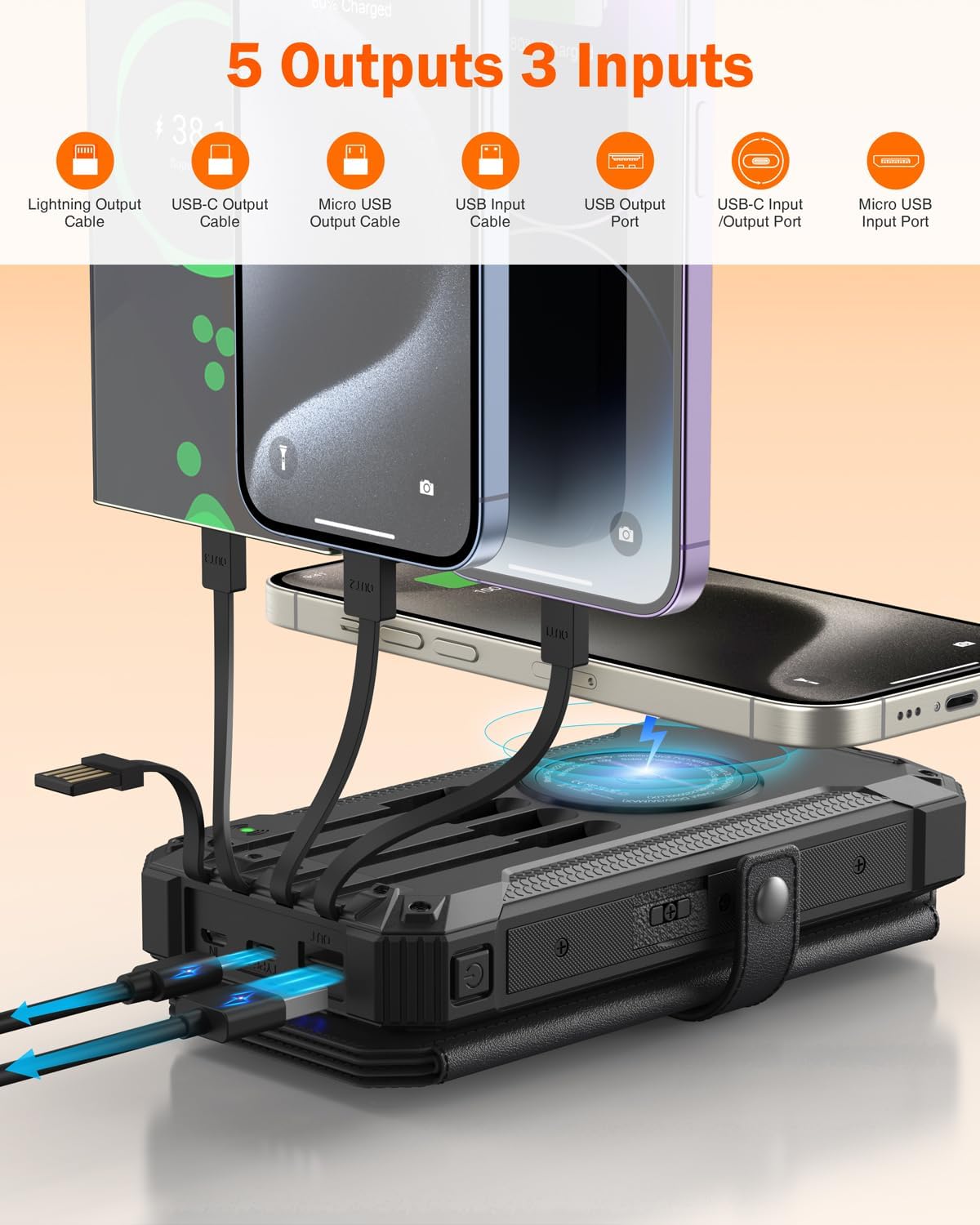 - [Built-in Cables for Multi-Device Compatibility] : Say goodbye to the hassle of carrying multiple charging cables. The solar charger comes equipped with four built-in output cables, catering to a variety of charging needs. Featuring multiple ports, it can power up to five devices simultaneously, offering unparalleled convenience for your mobile lifestyle
