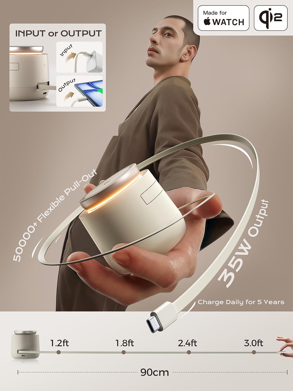 - âĄăAdditional 3FT Retractable CordăBased on the traditional 3 in 1 charging dock, we have additionally designed a built-in 3ft retractable cable, it can be used for either input or output. When used as an input, it can be connected to an adapter to supply power to this charger cube. When used as an output, it can charge your fourth device, be it your iPad or Android device. It keeps you away from the hassle of tangled wires and truly serves as the ultimate solution for your wireless charging needs and it can be adjusted in several levels to meet different length needs. 50000+ pull-out test to ensure durability and safety, eliminating concerns about product longevity or structural integrity.