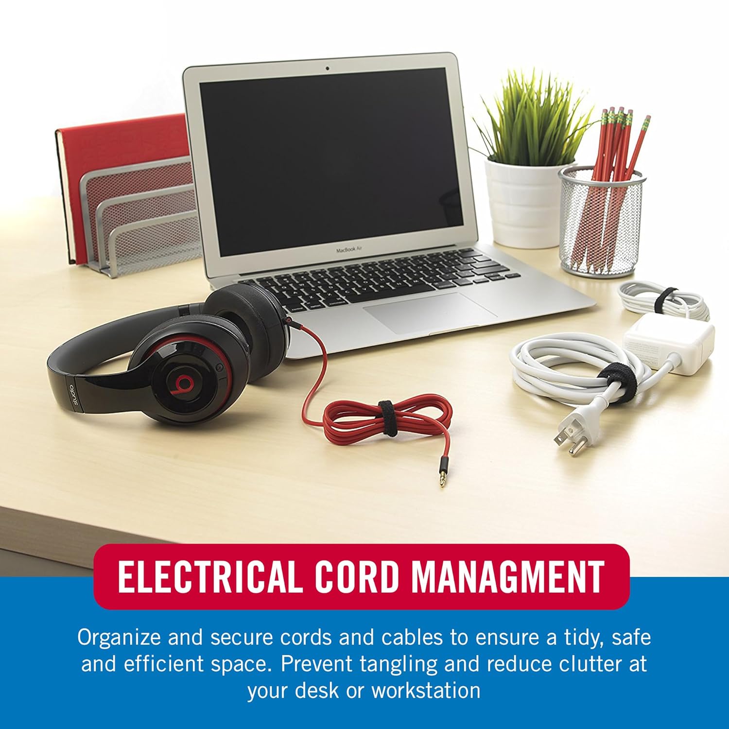 - ELECTRICAL CORD MANAGEMENT: Organize and secure cords and cables to ensure a tidy, safe and efficient space. Prevent tangling and reduce clutter at your desk or workstation