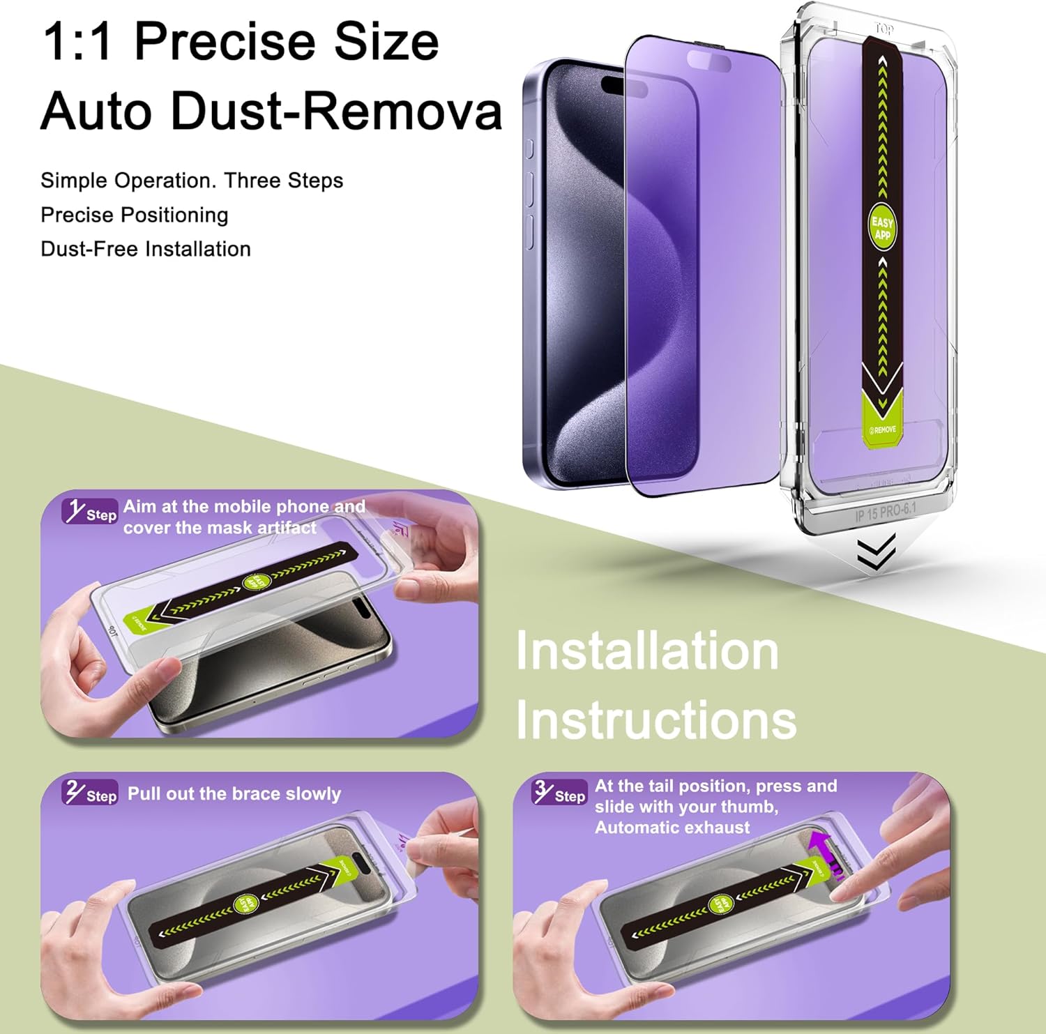 - Auto Dust Removal & Easy Installation: The SY SHANGYAN Anti Blue Light Matte Screen Protector for iPhone 15 Pro features advanced auto dust removal and self-aligning technology for a flawless,bubble-free install every time.Just place the frame,pull the tab,and press to push out any air bubbles.Installation is quick,easy,and hassle-free.For best results,watch our step-by-step installation video before applying