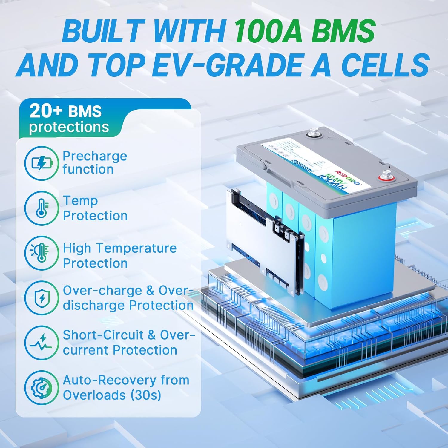 - ă Built in100A BMS & Grade A CellsăRedodo 12V LiFePO4 battery 100Ah is built in 100A BMS to prevent the damage of 100Ah lithium battery from overcharging, over discharging, shortened, hightemp and overcurrent, realize comprehensive protection for the battery. Assemble with top-tier battery cells to guarantee stable battery performance, low self-discharging rate. With 10 years lifespan empower you no more budget for frequent battery replacements.