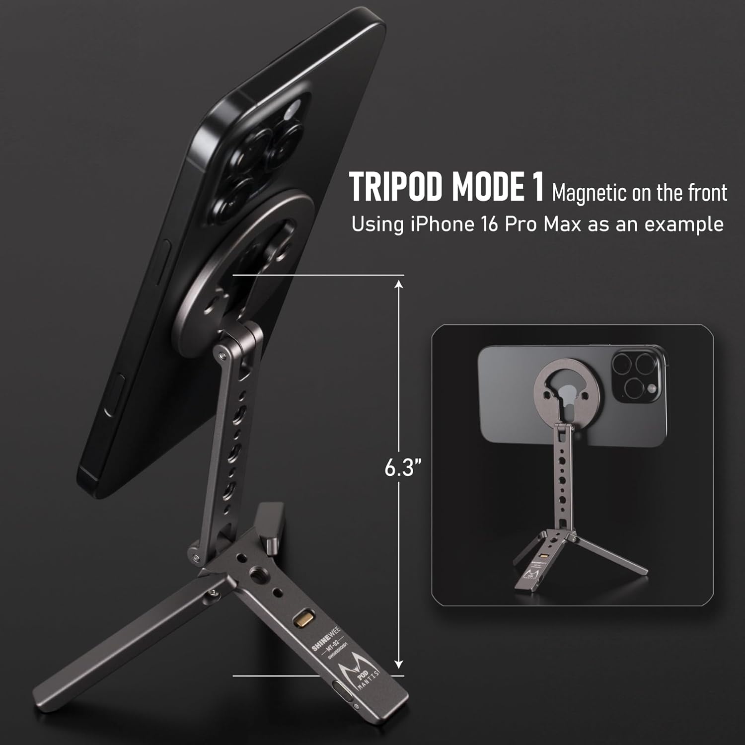 - â–¶Stable Stand & Adjustable Viewing Angles:â—€ Unfold the three legs to create a stable base on any flat surface like desks, tables, or countertops. The maximum height from the center of Magnetic to the support surface is 5.5", and the height of the phone can be adjusted by tilting, you can easily adjust your iPhone to the perfect angle for browsing, streaming, or capturing photos and videos.