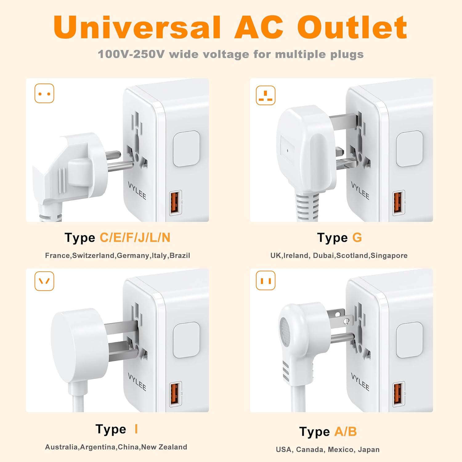 - 5 in 1 Universal Travel Adapter: This Universal Power Adapter offers a universal AC outlet and 4 USB charging ports, the universal outlet converts plugs of US, EU, UK, AU, max power 1000W at 100V and 2500W at 250V, which can charge up to 5 devices at the same time. You can take it charging anywhere such as airports, hotels, dormitories. It allows you to get a super fast charging experience when you go to the worldwide travel