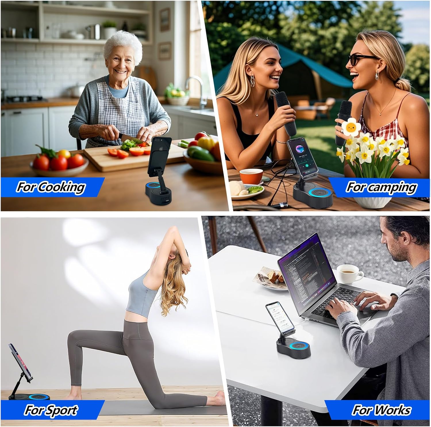 Gifts for Men Women,Cell Phone Stand with Wireless Bluetooth Speaker,Colorful Ambient Light 360° Foldable for Tablet iPhone Android 2 Wireless Microphones HD Surround Sound (Black)