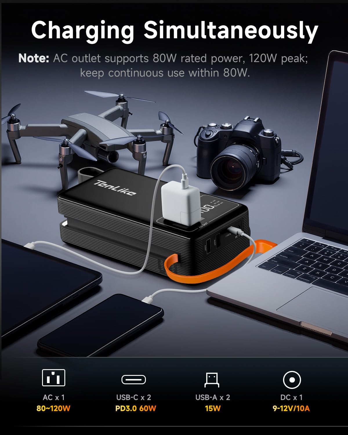 - ăBuilt-In 60W PD Fast Charging CableăOur Tenlike power station features a built-in 60W PD fast charging cable, providing efficient charging for your devices. Quickly recharge your smartphone, tablet, or laptop, helping you stay powered up and connected when you need it most