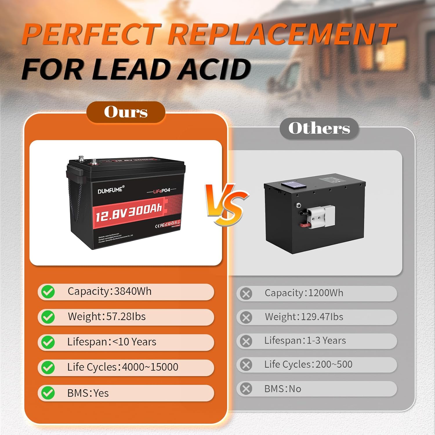 - Small Size & High Energy: The 12V 300Ah Lithium Iron Phosphate Battery Weighs Only 57 lbs, 1/3 The Weight Of A Comparable Lead-Acid Battery. Its Energy Density Is Nearly Double That Of An Equivalent Lead-Acid Battery, With An Impressive Energy Capacity Of Up To 3840Wh. Its Compact Design Is Easy To Carry And Install, Delivering Maximum Functionality In Minimum Space.