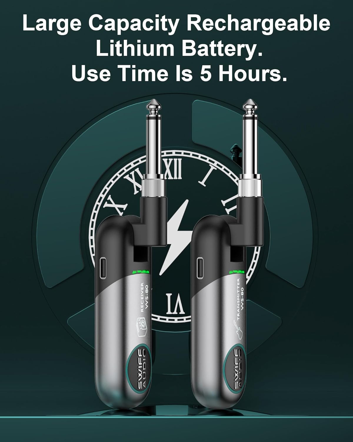 - Rechargeable Wireless Guitar System: Guitar wireless system comes with a dual USB-C charging cable that allows you to charge both the transmitter and receiver at the same time for easy charging. It can be used for up to 5 hours on a full charge. Note: actual usage time will vary depending on local temperatures.