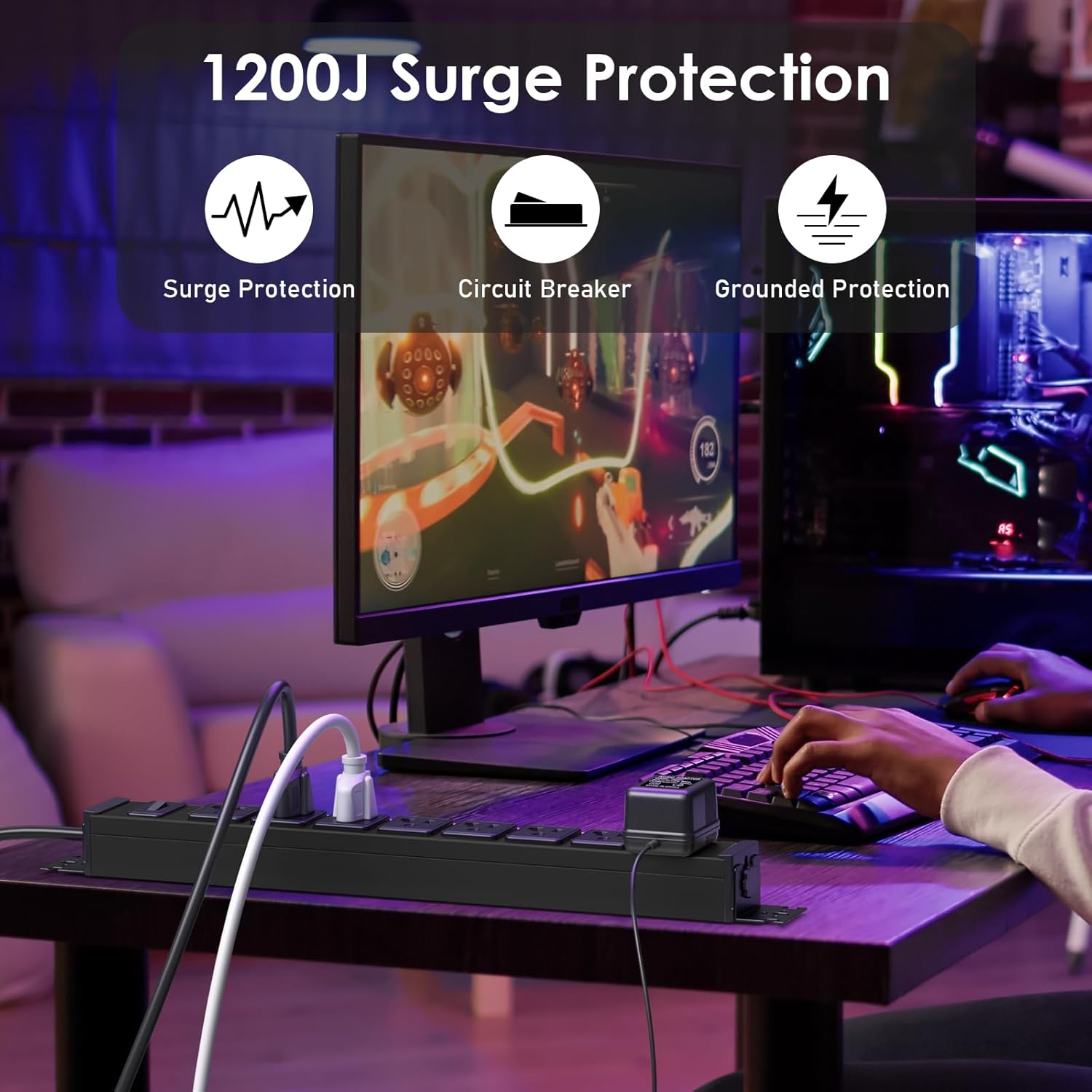 JUNNUJ Heavy Duty Power Strip Wall Mount, 20 Amp Surge Protector 1200J Metal 8 Outlet Under Desk Mounted 20A, Garage Power Table Socket Industrial Outlets 6-20R T-Slot, Black-15FT 12AWG Extension Cord