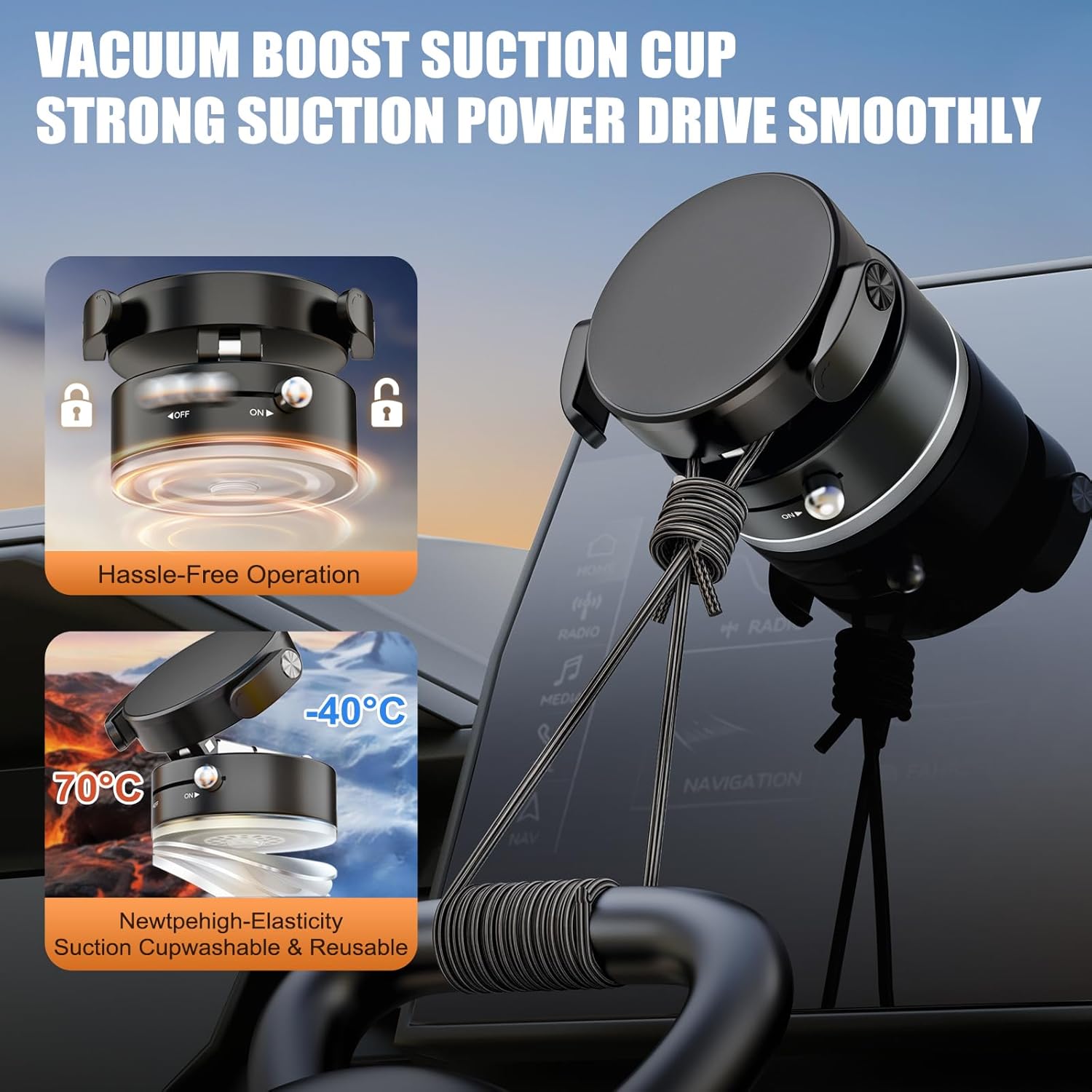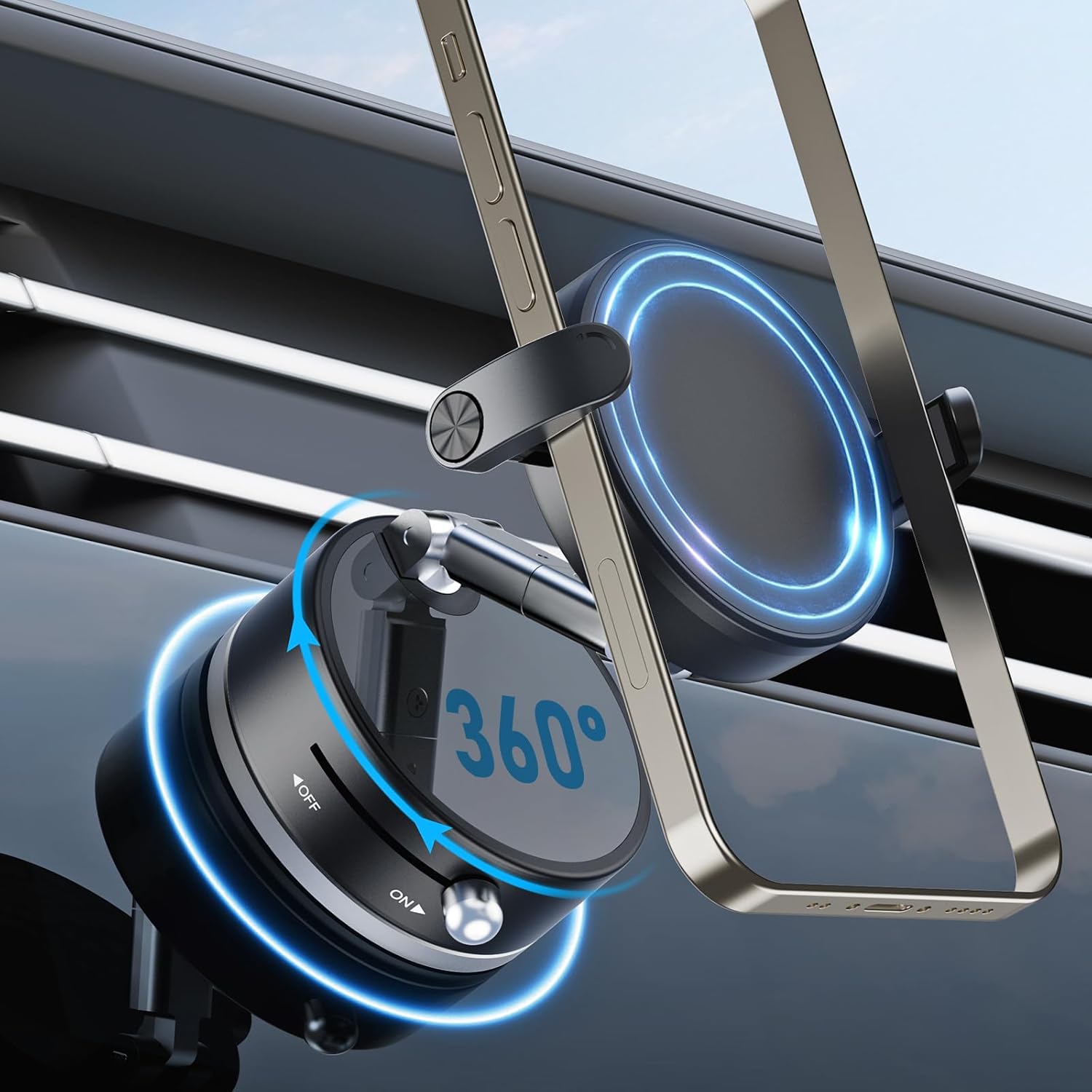- One-Touch Lock & One-handed Operation: The vacuum magnetic phone holder features an upgraded, enhanced suction cup at the base with the latest vacuum adsorption technology. Simply rotate the dial to securely attach it to any smooth surface, such as windshields, dashboard screens, or side windows. Even on bumpy roads, the car phone holder stays firmly in place. Easy to operate, can be completed with one hand.