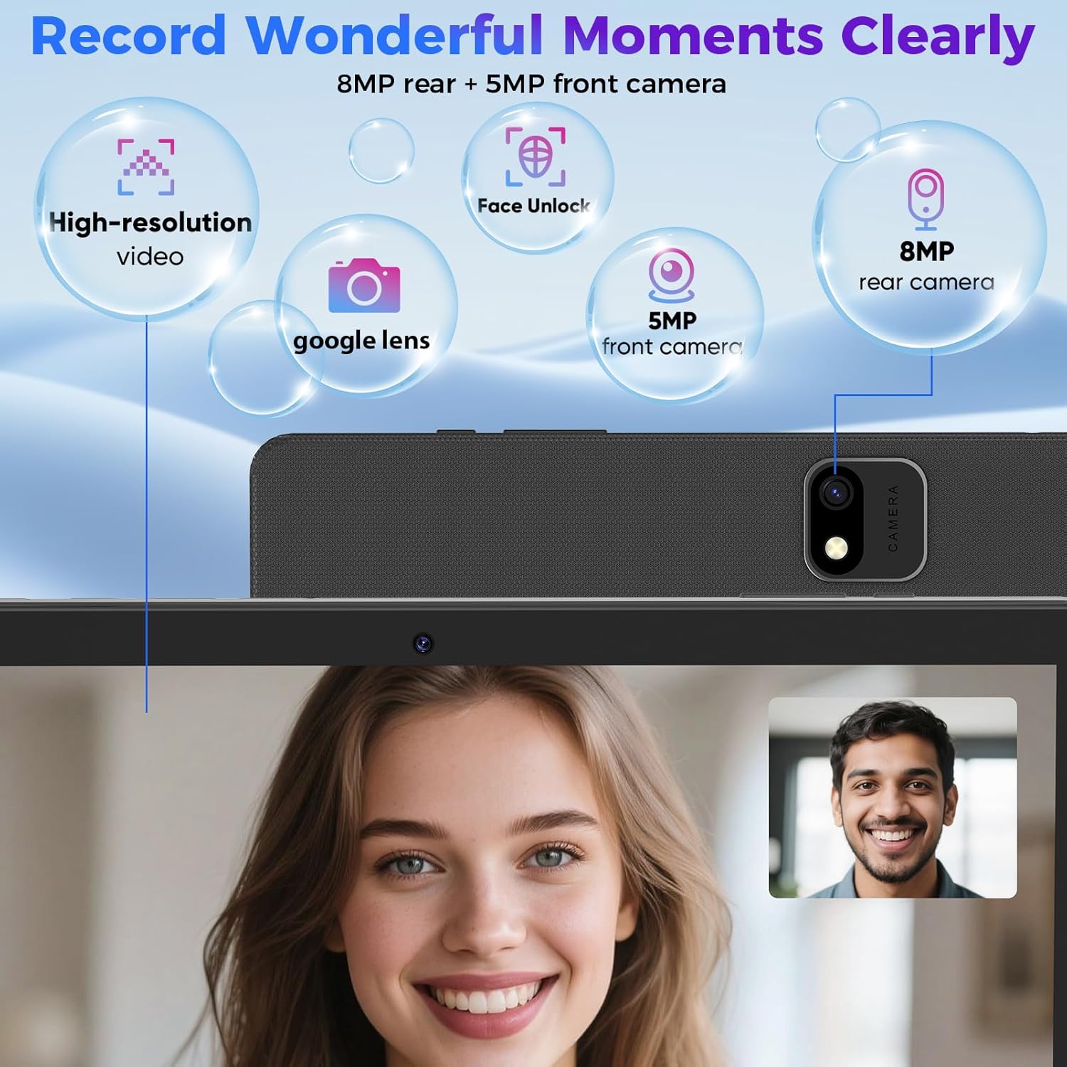 - 【High-Definition Immersive Audio-Visual】The 10.1-inch HD IPS display (1280x800 resolution) combines precise colour reproduction with a 120Hz high refresh rate, delivering a smooth and responsive visual experience and control feel, whether you're watching movies, playing games, or reading. The tablet with a keyboard is equipped with a 5MP front camera and a 8MP rear dual camera, meeting the needs of high-quality video calls, daily photography, and life recording.